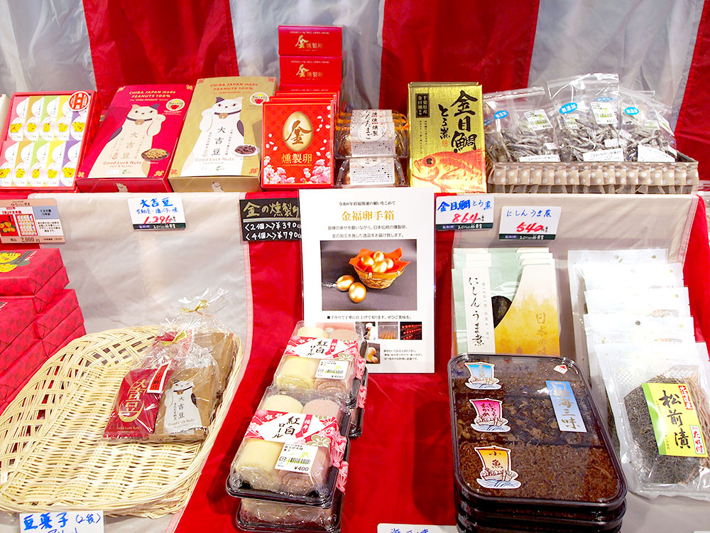 お正月らしい和菓子や千葉県の特産品、地酒や地元のしょうゆ・調味料もこちらにございます。