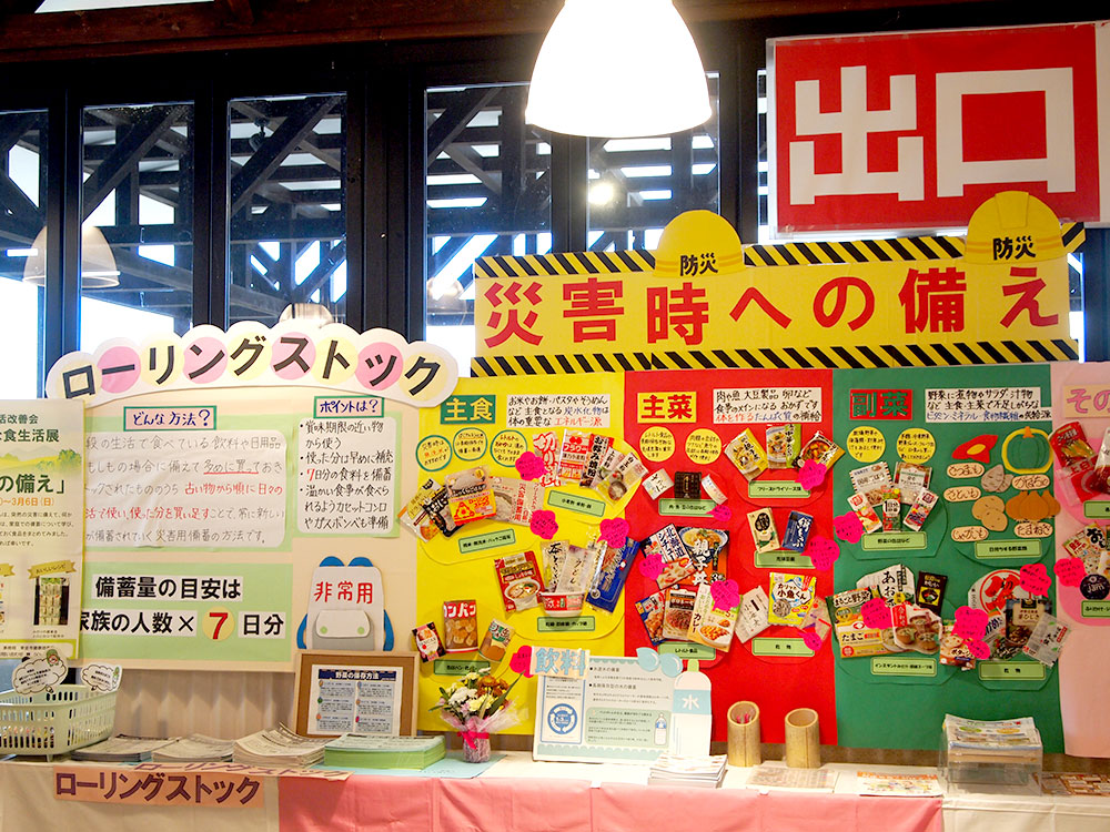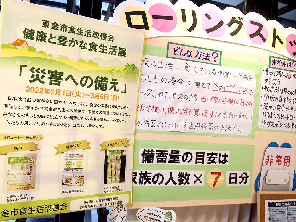 道の駅 みのりの郷 東金 情報発信コーナーにて、東金市食生活改善会の皆さんによる『ローリングストック』などをテーマとした健康と豊かな食生活展「災害への備え」研究活動展示が開催されています。(2022.3.6まで)