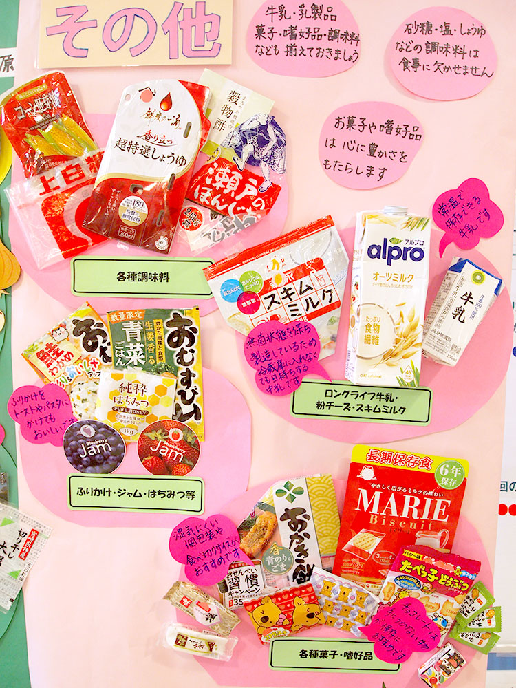 日本は自然災害が多い国です。みなさんは、突然の災害に備えて、何か準備していますか?東金市食生活改善会は、家庭での備蓄について学び、皆さんのもしもの時に役立つよう備蓄しておく食品をまとめてみました。