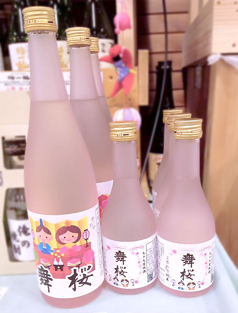 守屋酒造さんの舞桜「ひなまつり」ラベルです。瓶もほんのり桃の色で、かわいらしいですね!