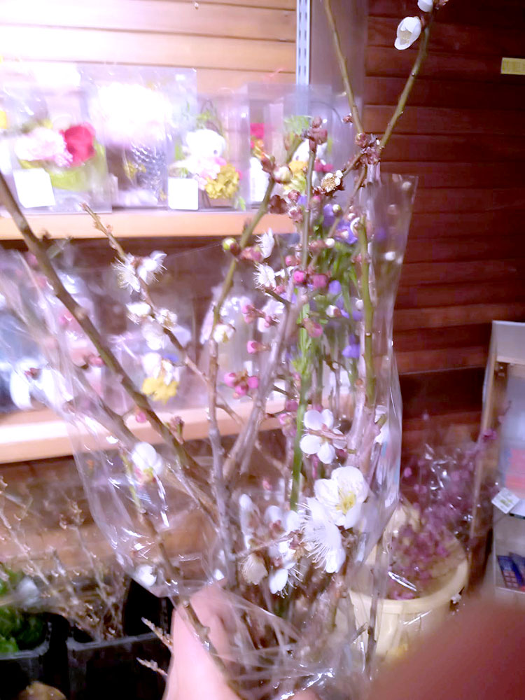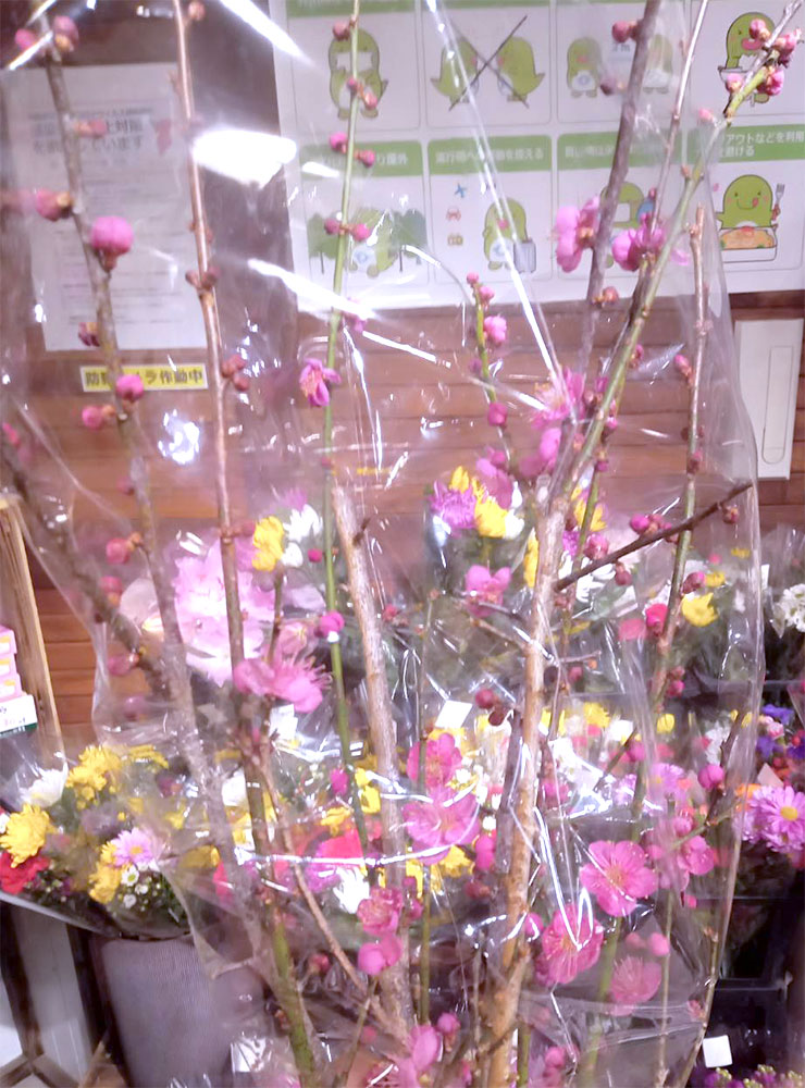 東金マルシェの生花コーナーには、梅の花枝が並んでいます。
