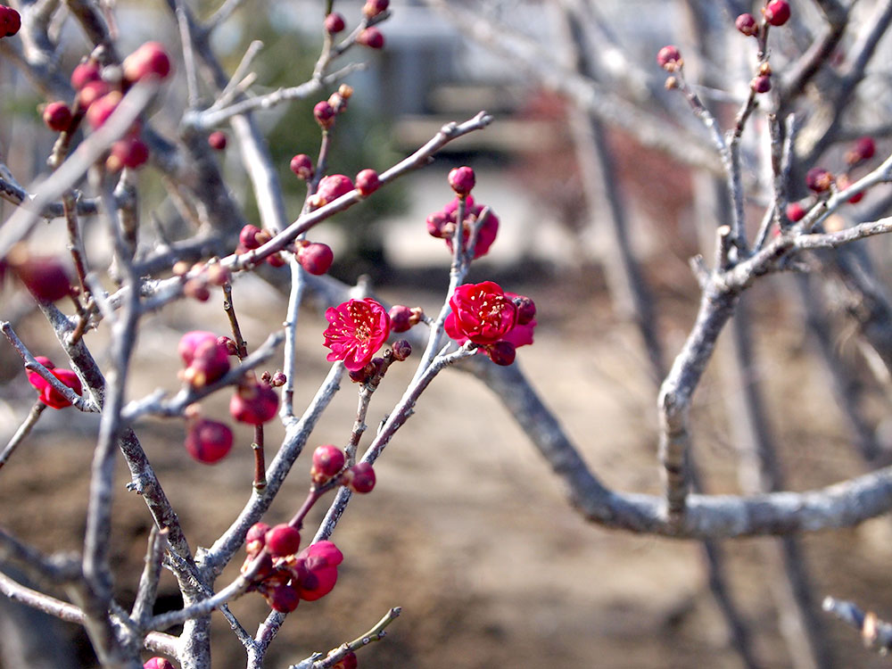 そのほか、圃場のあちこちに濃い紅色の花をつける「鹿児島紅梅」がちらほら並んでおります。