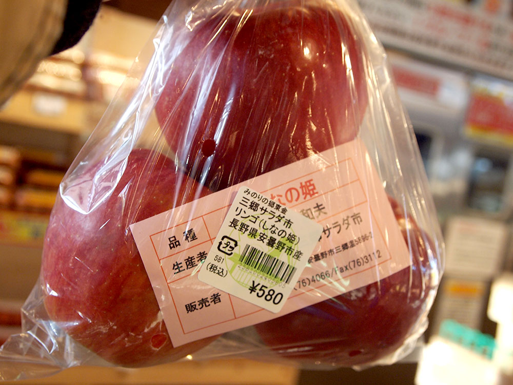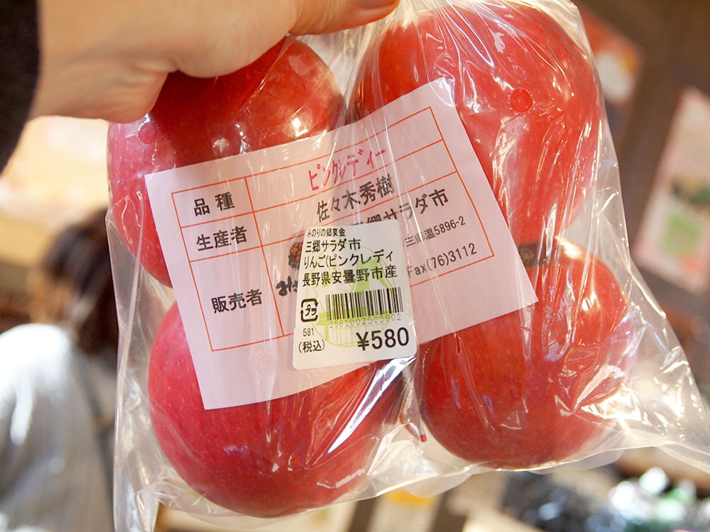 道の駅 みのりの郷 東金 東金マルシェでは、東金市の友好都市、長野県安曇野市から産地直送のりんごが並びます。