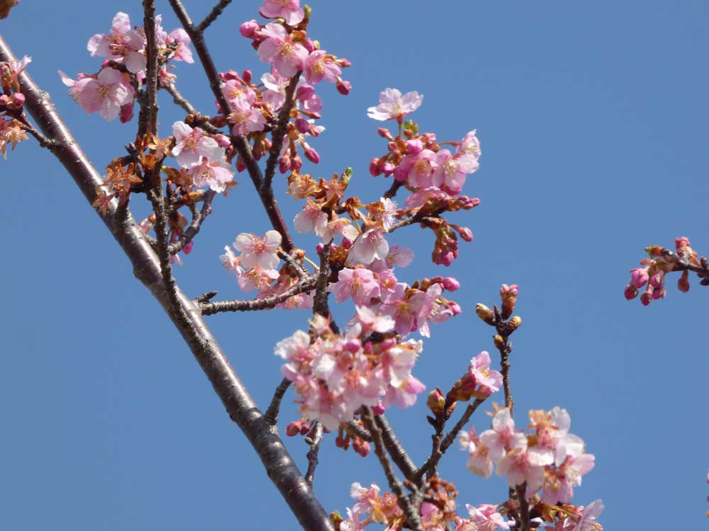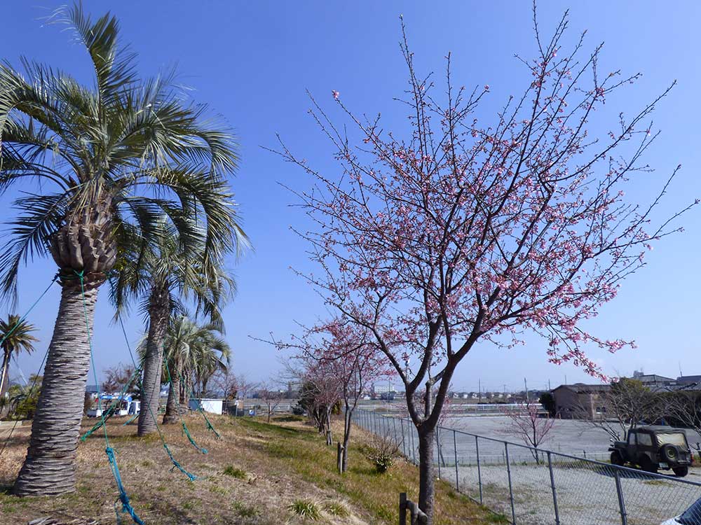 道の駅 みのりの郷 東金 では、加工場の隣に並んでいる河津桜がピンク色になってきました。