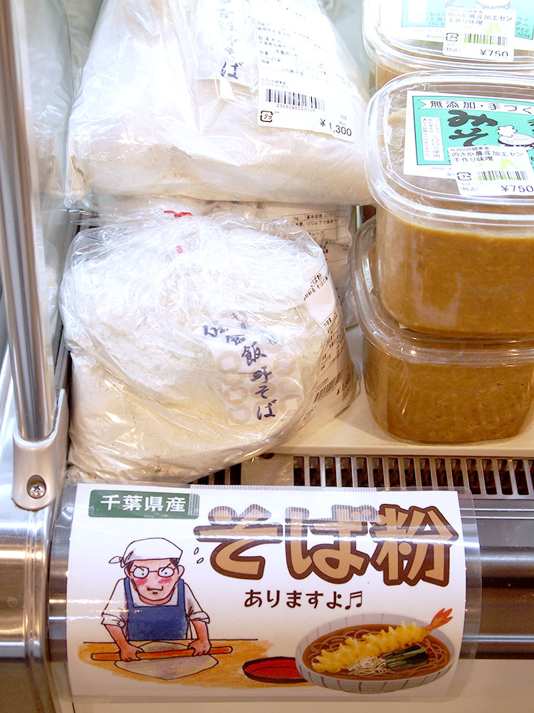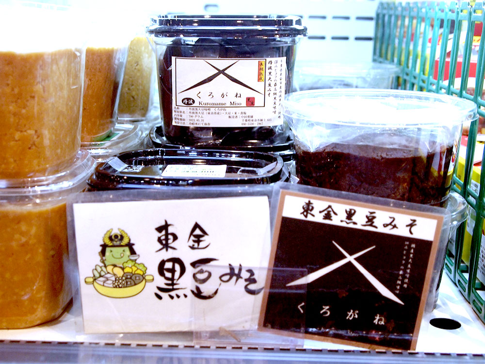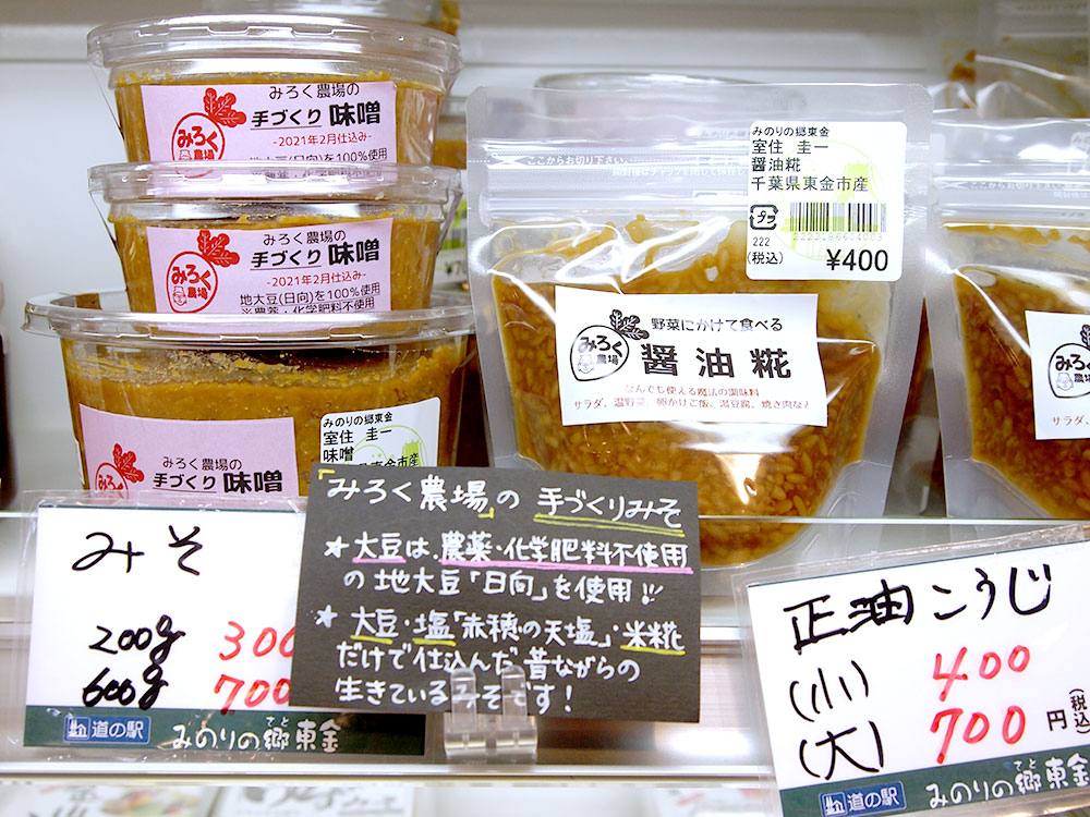みろく農場さんの手作り味噌や醤油糀、千葉県産そば粉、東金黒豆みそ「くろがね」、海草などがございます。
