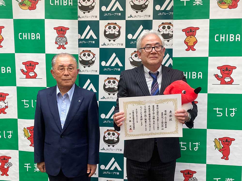 令和4年5月23日(月)千葉県農業会館にて弊社代表取締役 井上一雄へ「令和3年度千葉県産米需要拡大推進功績者表彰」賞状と「おにぎりチーバくん」ぬいぐるみが授与されました。