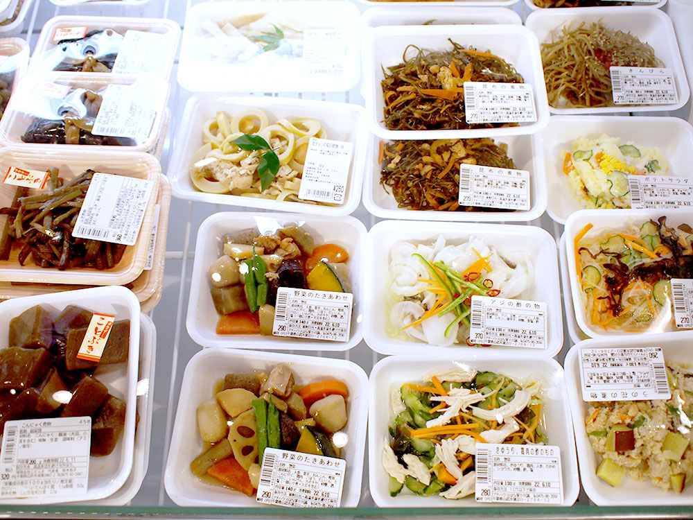 お惣菜は、今お野菜コーナーに並んでいる旬のお野菜のお惣菜が並びます。