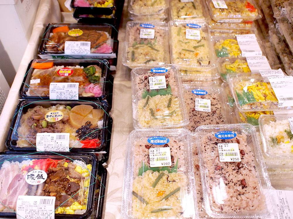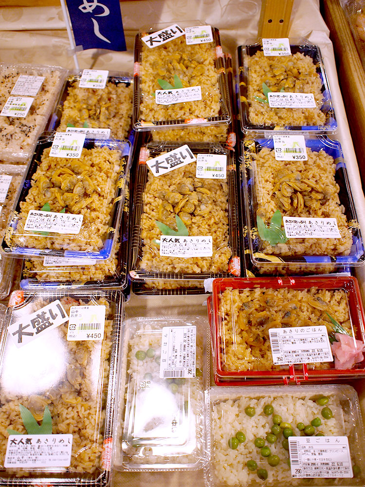 お弁当コーナーは、人気の味良さんの「天むす」、東金のおそばの老舗「東京庵」さんの「お蕎麦屋さんのかつ丼」、中華料理アジアンさんの中華弁当、九十九館さんの「とりくつね弁当」、ワンマイさんのタイ料理弁当、巷で大人気の「あさり飯」、農家のおかみさんの作るお赤飯やおこわ、お肉屋さんサンライズファームさんのお弁当などなど!