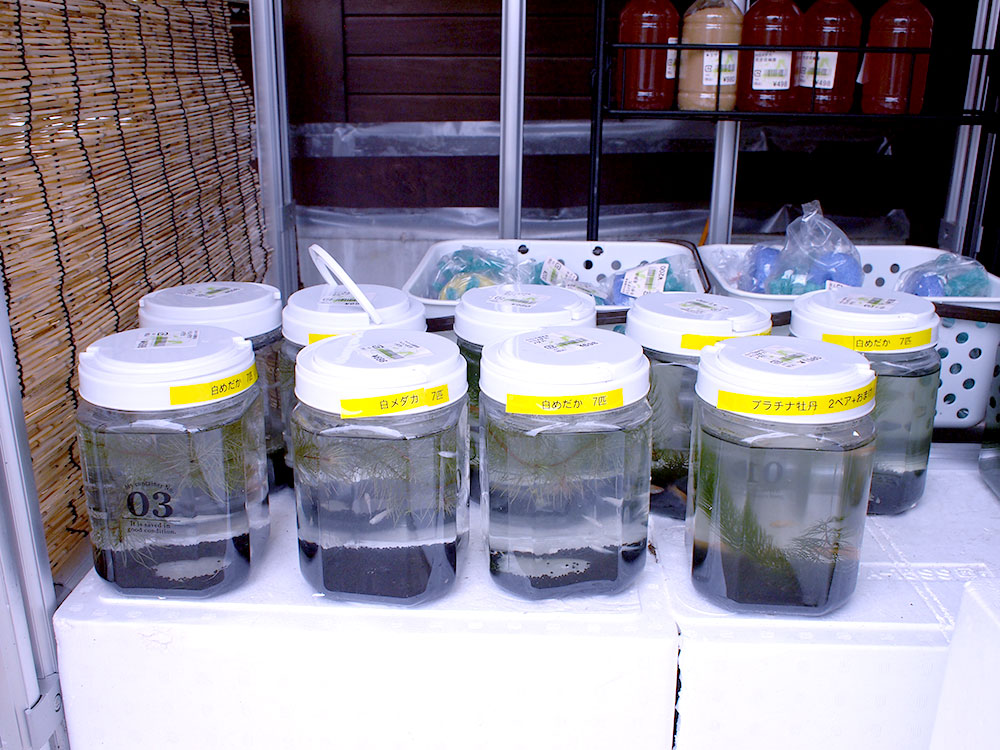 メダカの環境に必要な水草等もお手頃価格で並んでおります。