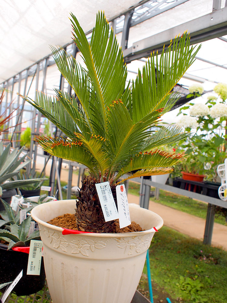 直径40センチぐらいの立派なサボテン(金鯱)、珍しいキンカンソテツ(金環蘇鉄)は葉のふちが黄色くなり美しいですね。