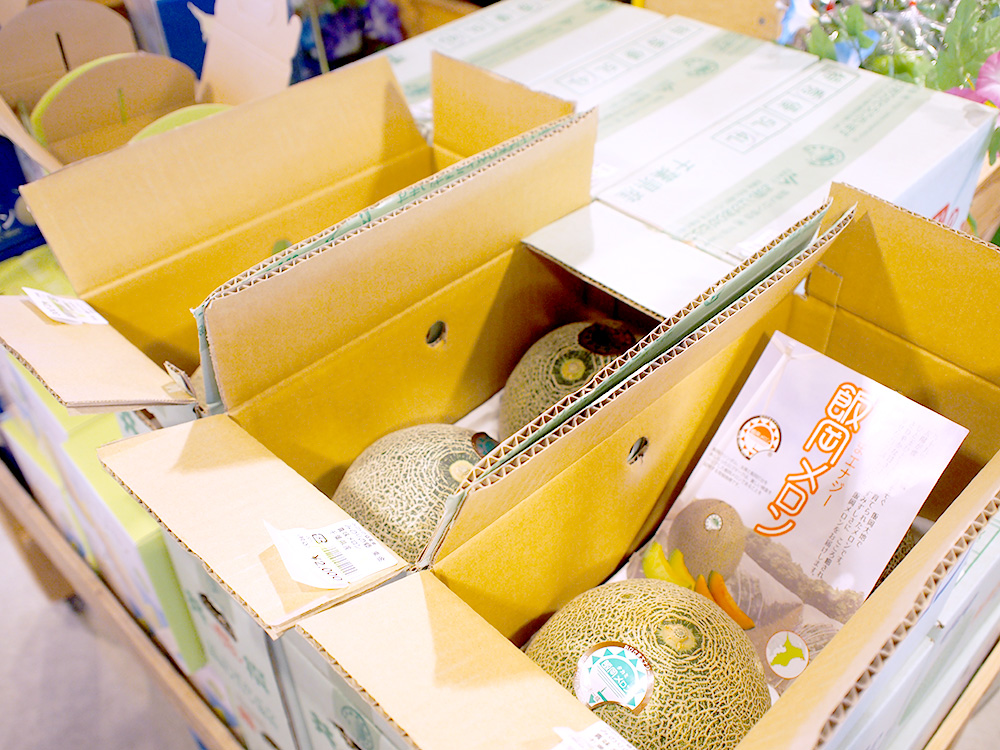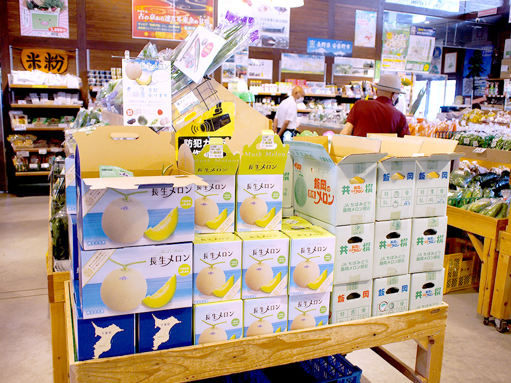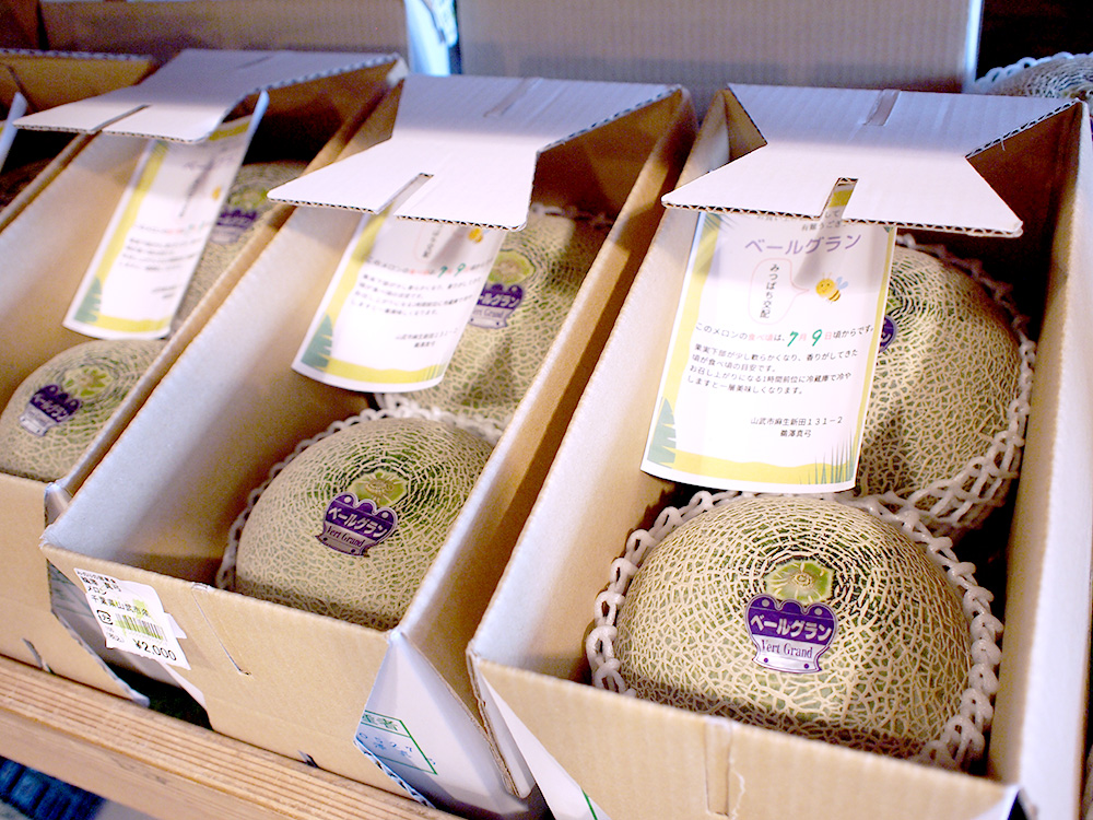 山武市産の「ペールグラン」という、一株から一果だけを厳選して育てられた幻のメロンも並んでいます。