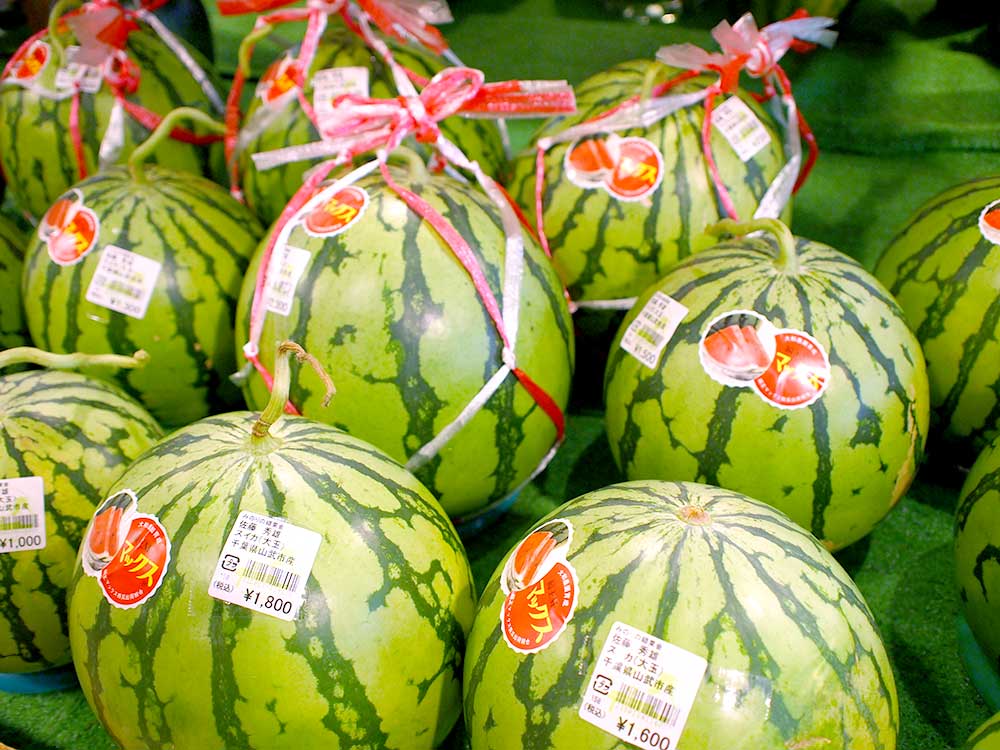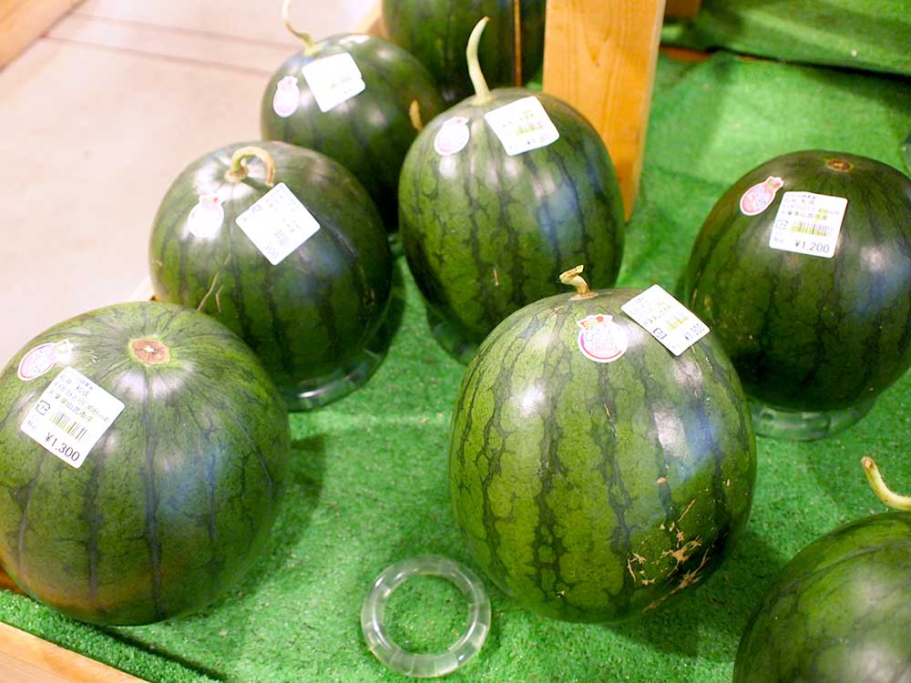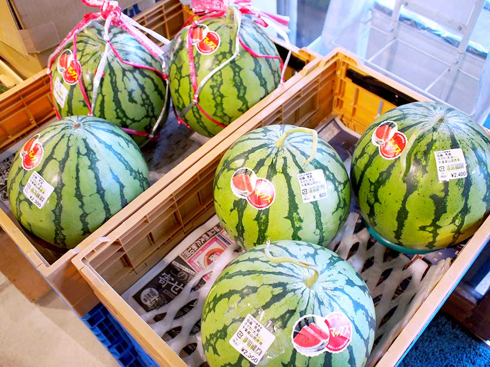 奥の果実コーナーには小玉のスイカがたくさん並んでいますよ。