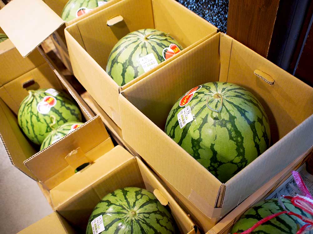 まずはお問い合わせの多い「スイカ」ですが、入り口付近に大玉やご贈答用の箱入りが並んでます。