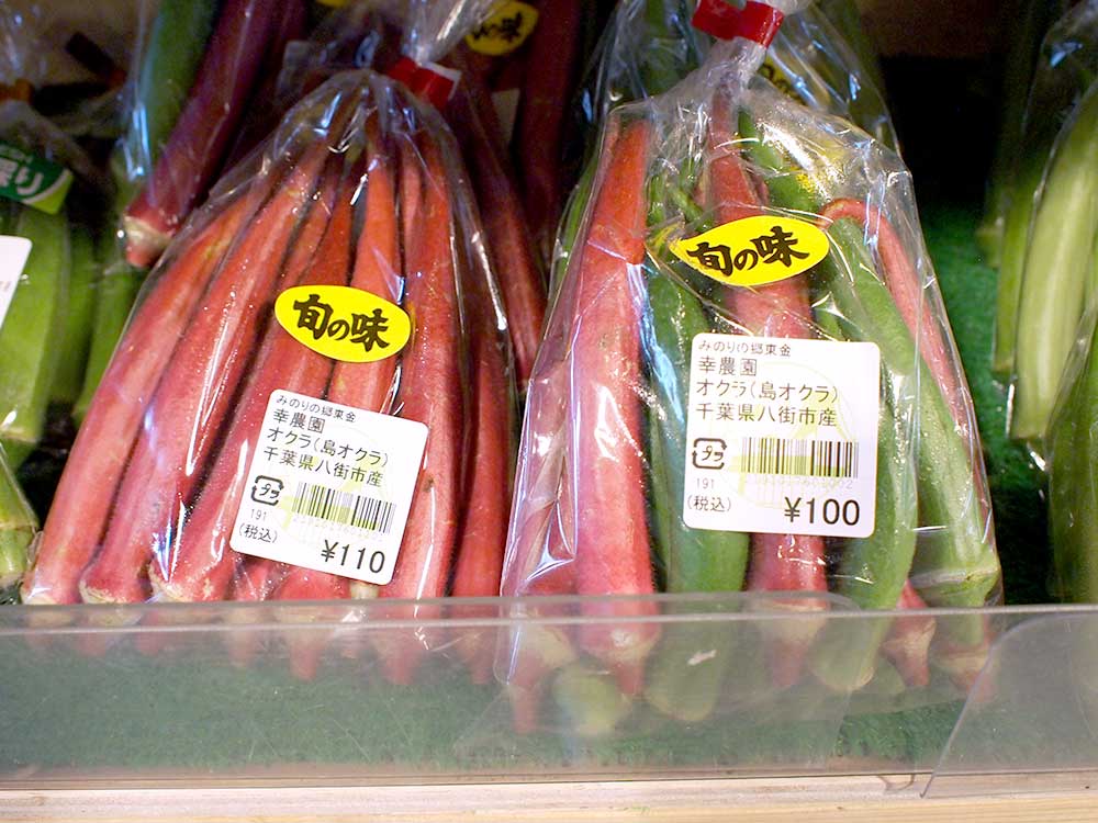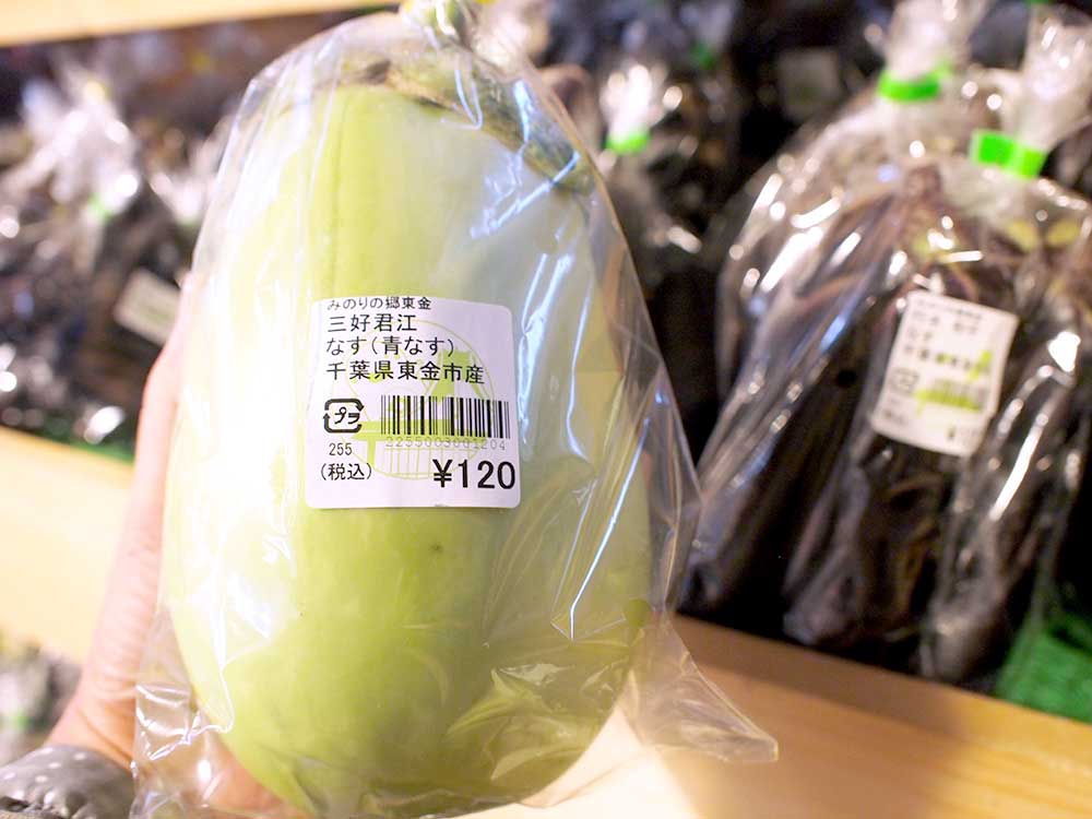 とても大きい青ナス、オクラもいっぱい並んでいます。