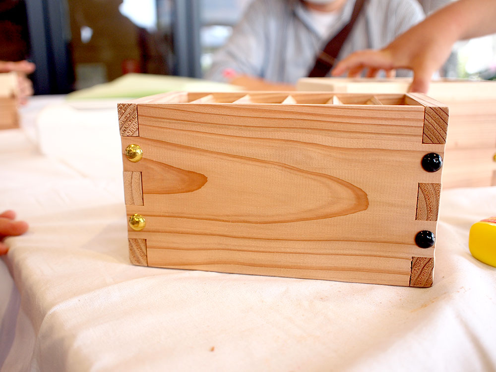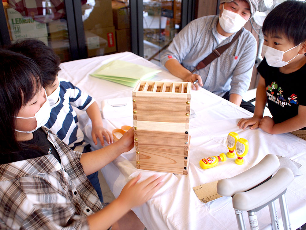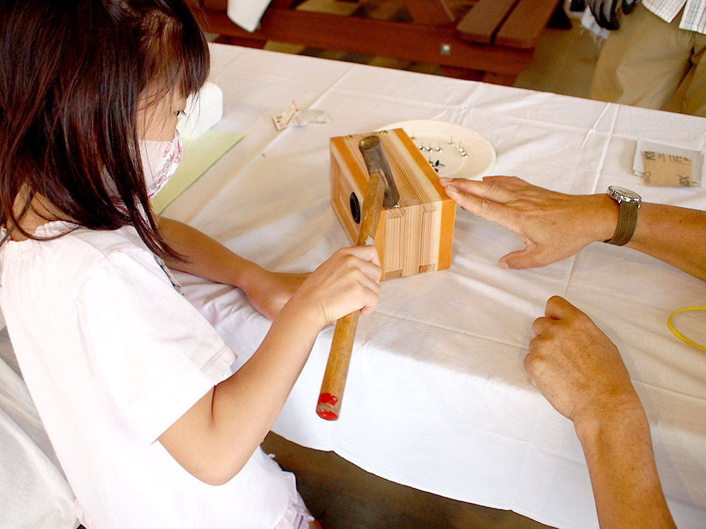 一般社団法人千葉県木材振興協会のみなさんと、サンブスキを活用した特産品の製作に積極的に取り組んでいる千葉県木育コーディネーター 株式会社山二建具の二村 和広 先生が、東金のちびっこたちに優しく・詳しく・丁寧にご指導をしてくださりながら、サンブスギを活用したお賽銭箱型貯金箱を作りました。