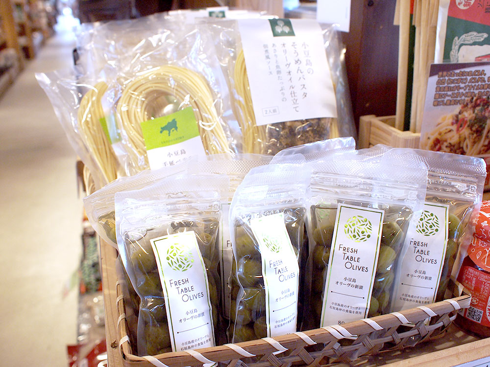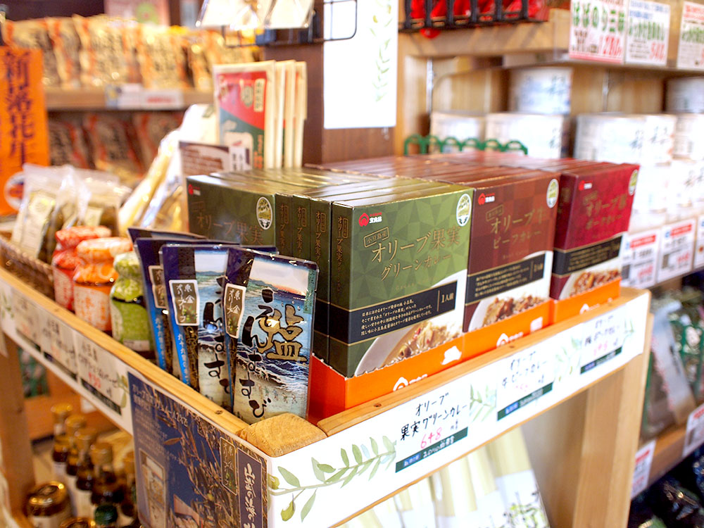 道の駅 みのりの郷東金 東金マルシェ入口すぐの季節棚コーナーが、小豆島ヘルシーランドから届いたオリーブ商品を中心としたラインナップになりました。