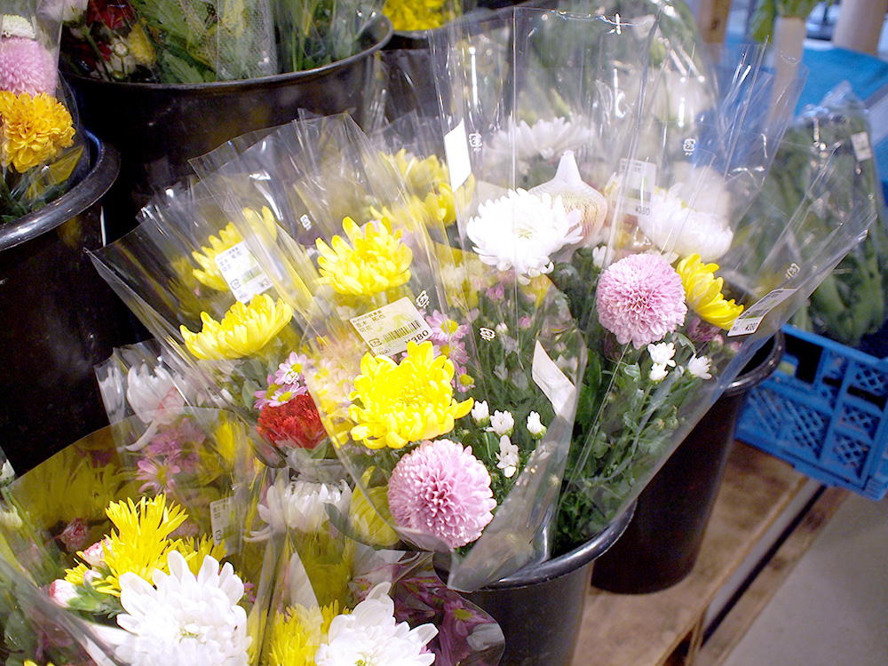 菊の季節なので、様々な菊の品種の花束が可愛らしいです。