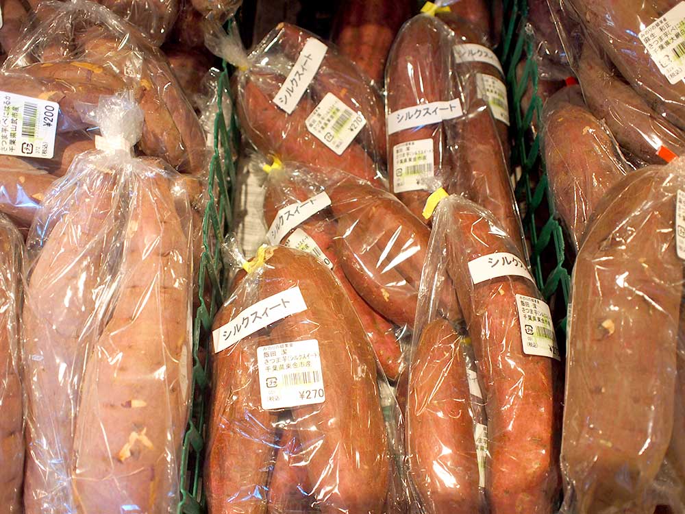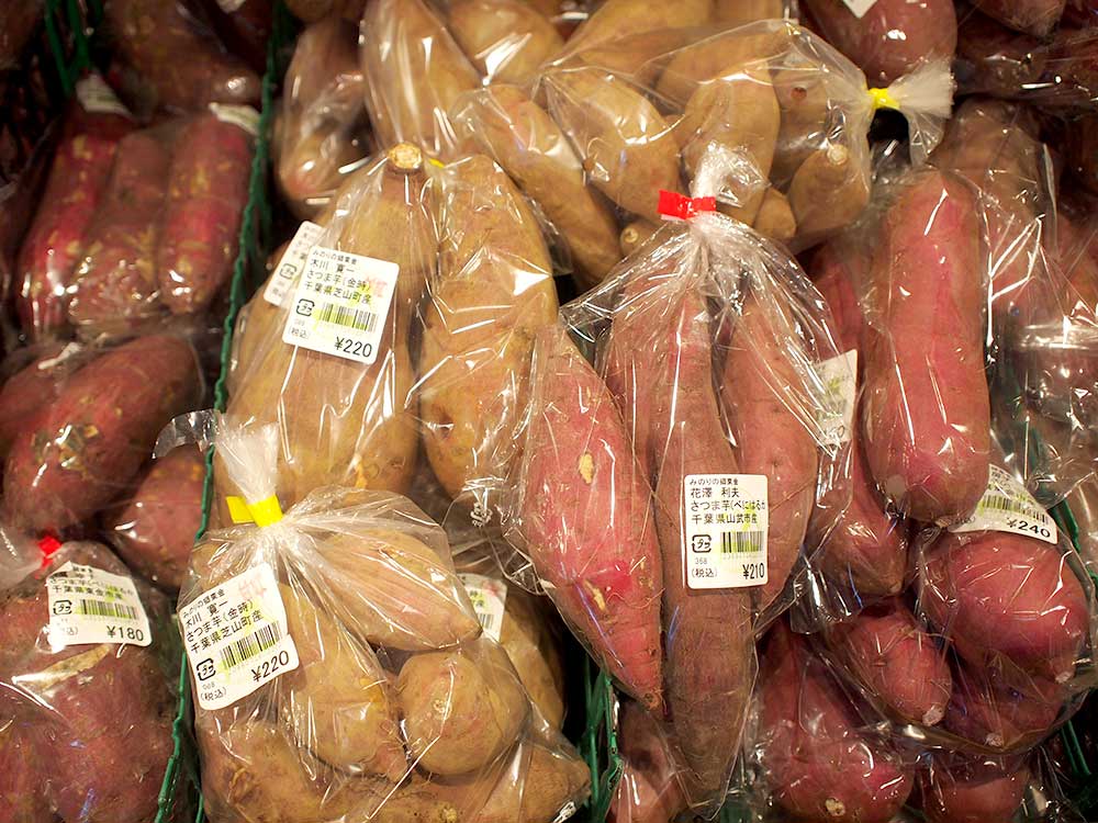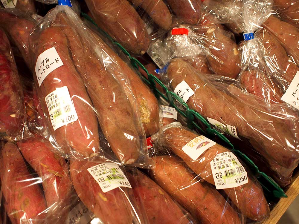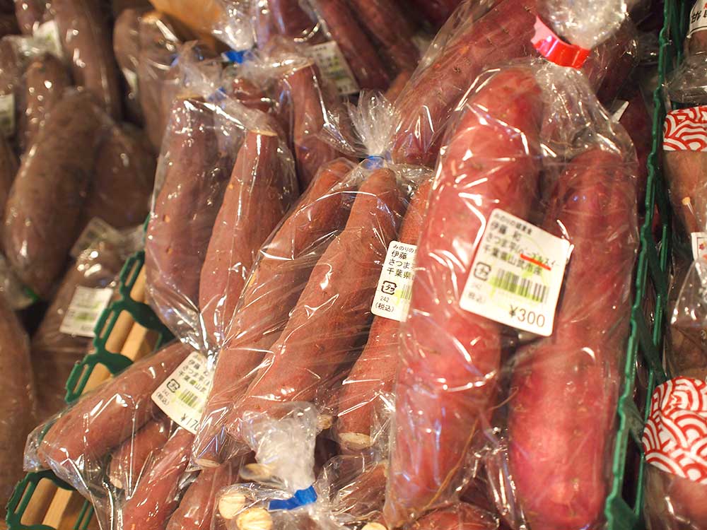 秋に収穫して、しばらく寝かせておいて糖度が増したところでずらりと登場しているサツマイモ。