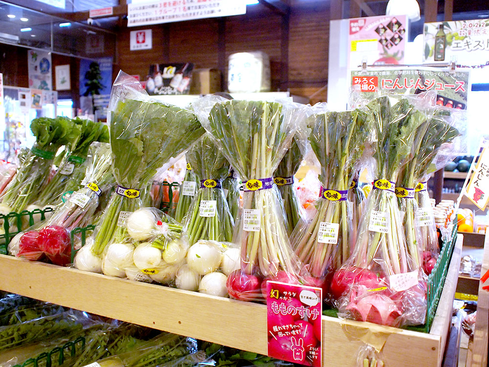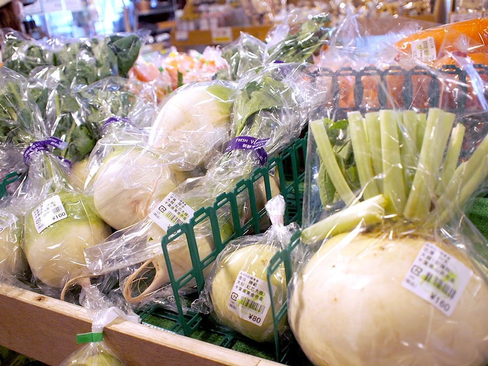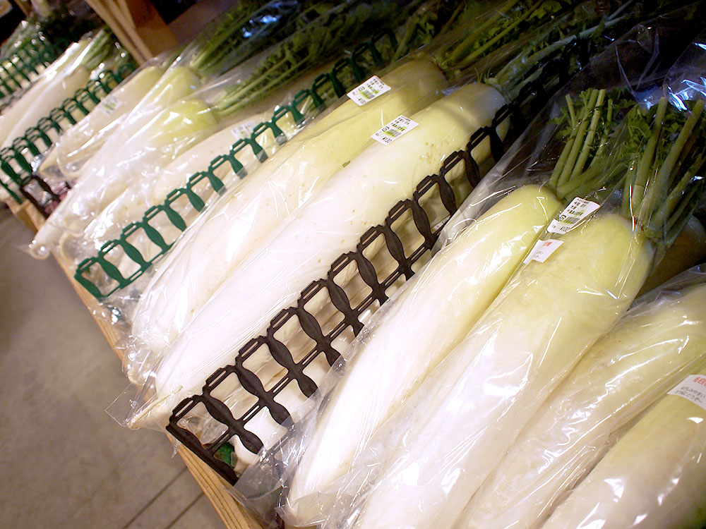 葉付き大根が丸々太って大きいです。紅心大根や聖護院大根などもありますね。カブもたくさん並んでいます。