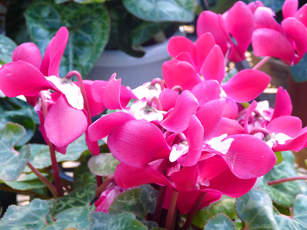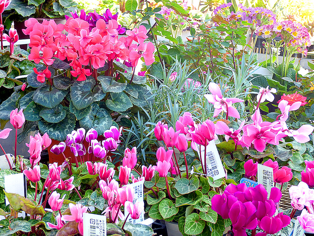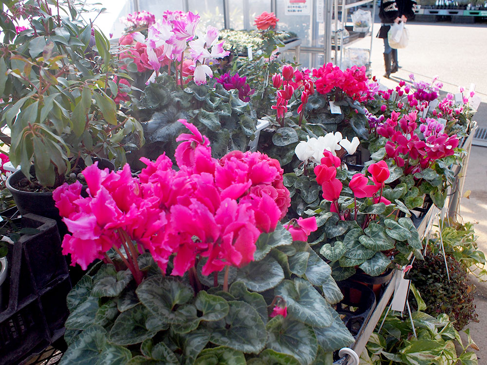 華やかなシクラメン、ガーデンシクラメンもまだまだございます。上手にお世話をすると5月ごろまで花が楽しめるそうです。