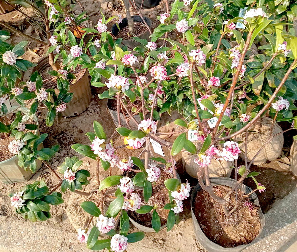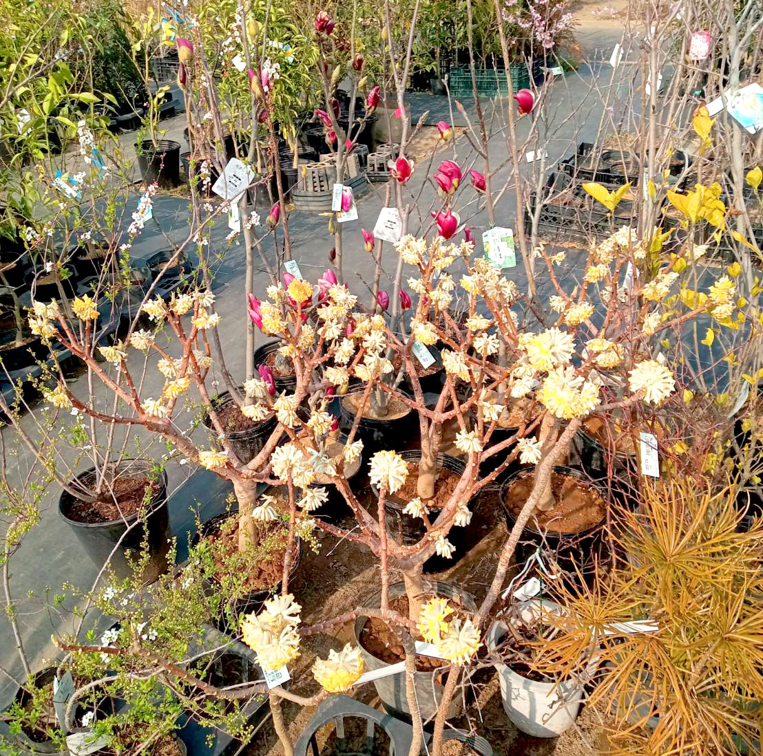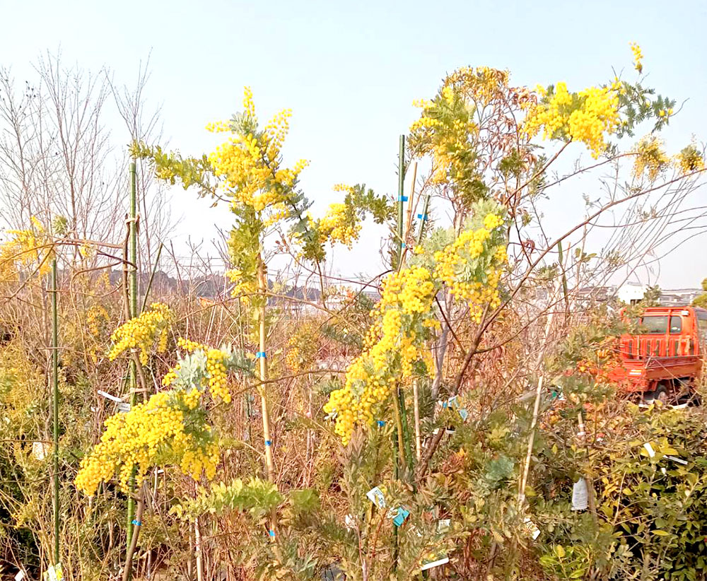 植木の圃場では、沈丁花(ジンチョウゲ)、ミツマタ、ミモザアカシアが満開!今週末が見頃です。