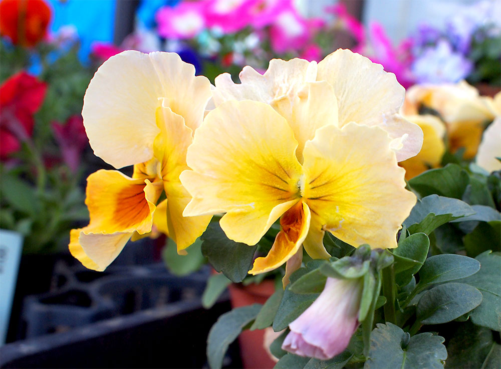 可憐さピカ一!のスミレの花苗は、珍しい花びらがフリルになっているタイプがたくさん並んでいます。