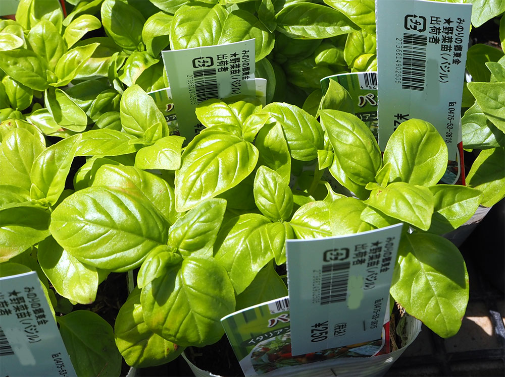 つるなしいんげん、スナップエンドウ、バジル、千両ナス、トマト各種が並びましたー!