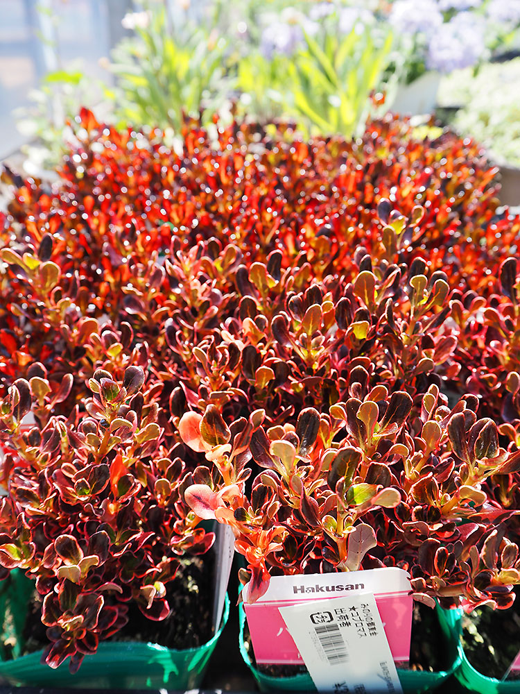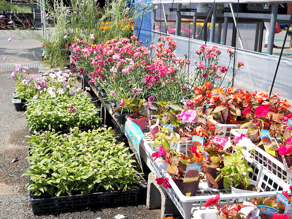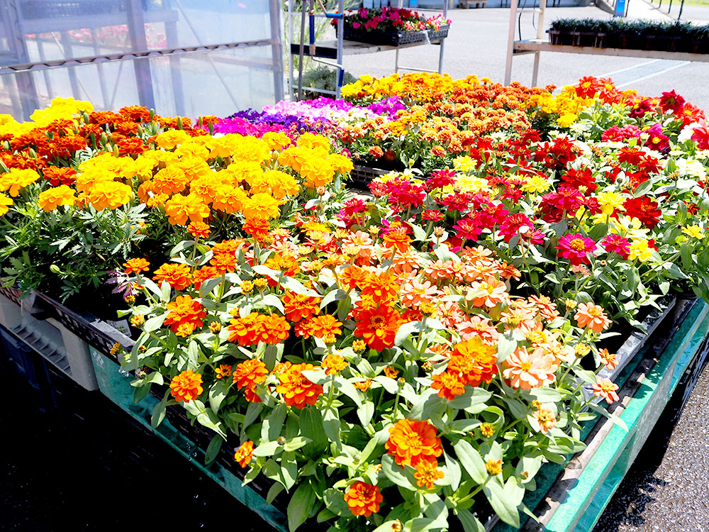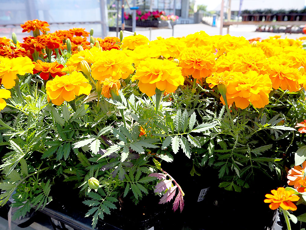 赤いコプロスマやマリーゴールド、宿根バーベナ ピンクパフェなど、夏のお庭を彩る苗がズラリとそろっております。