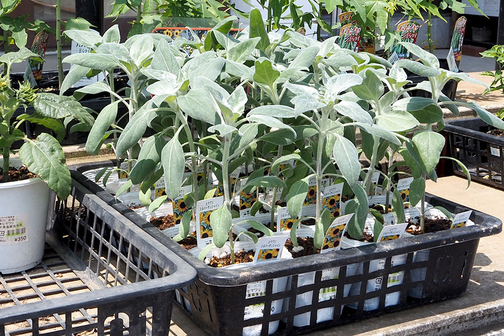 珍しい品種のひまわり「シルバーサンシャイン」は、葉がシルバーで枝分かれしてたくさん花が付くタイプです。