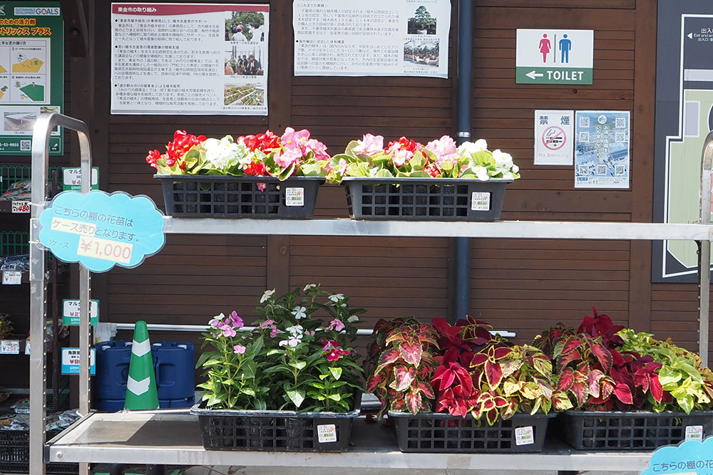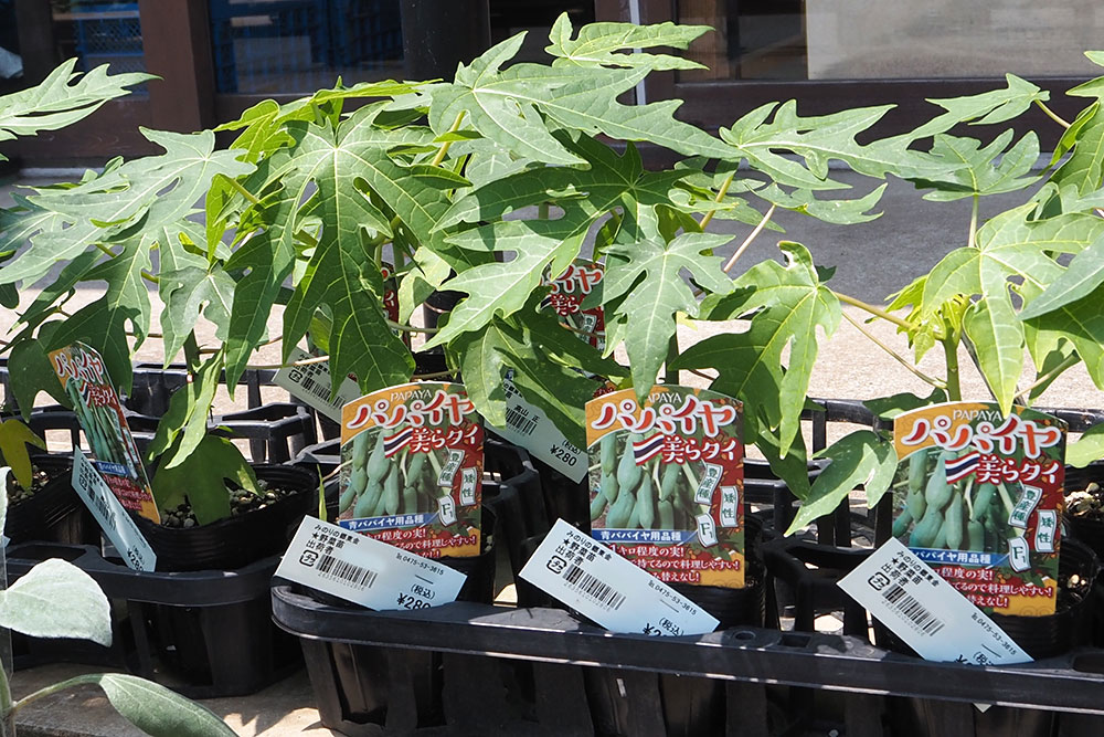 実が付くのが楽しみなパパイヤの苗や、ケース売りのお得な花苗がレジ横コーナーに並んでいます。