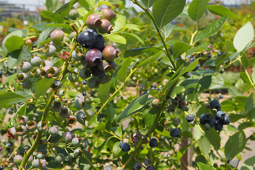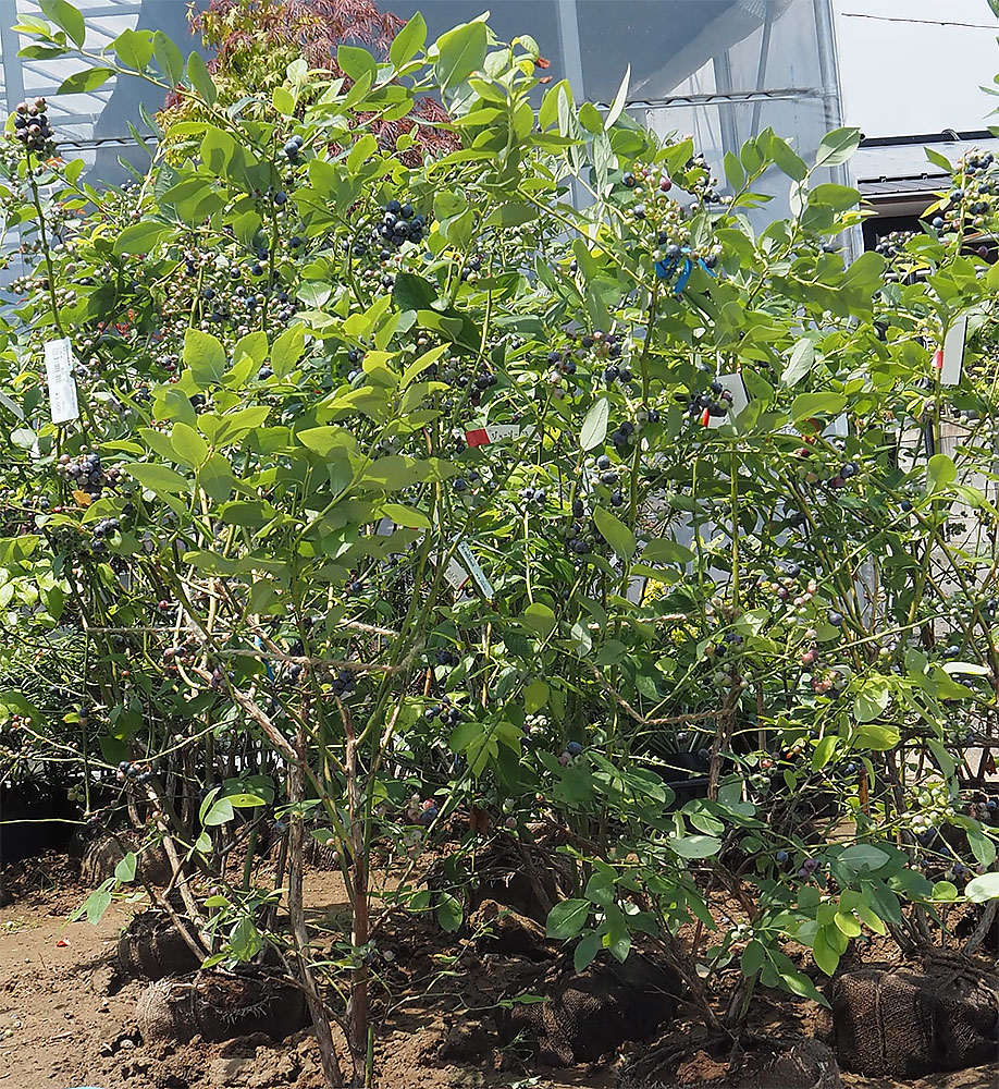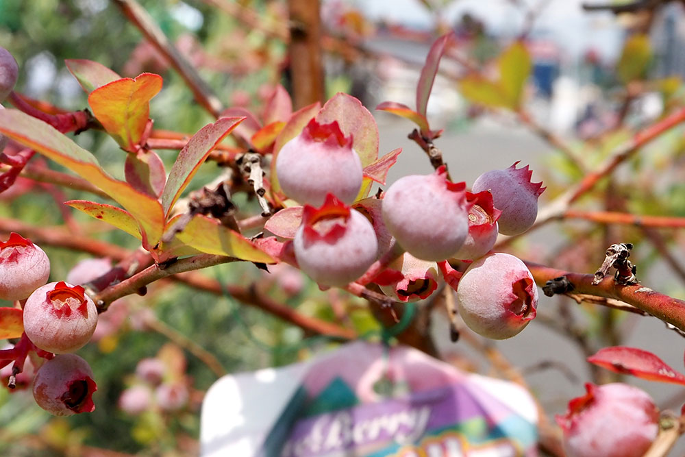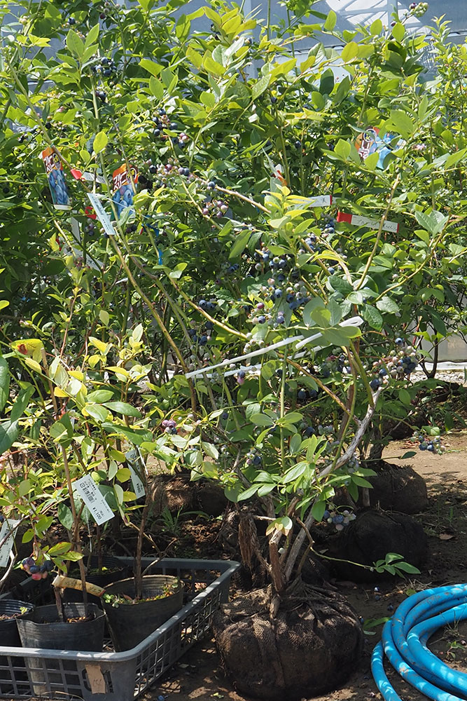 緑花木市場のあちこちには、実がたわわについたブルーベリーの苗が並んでいます。