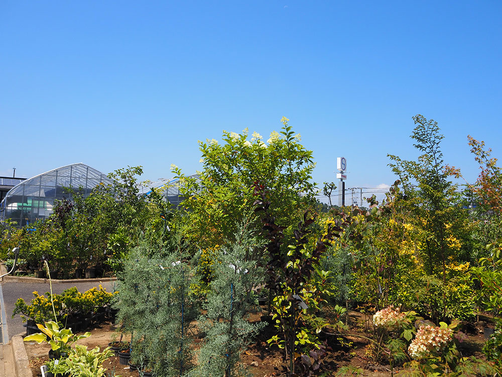 道の駅 みのりの郷 東金 緑花木市場では、夏の空の色に合う黄色い花の苗やアオダモなど爽やかな高木がたくさん並んでいます。