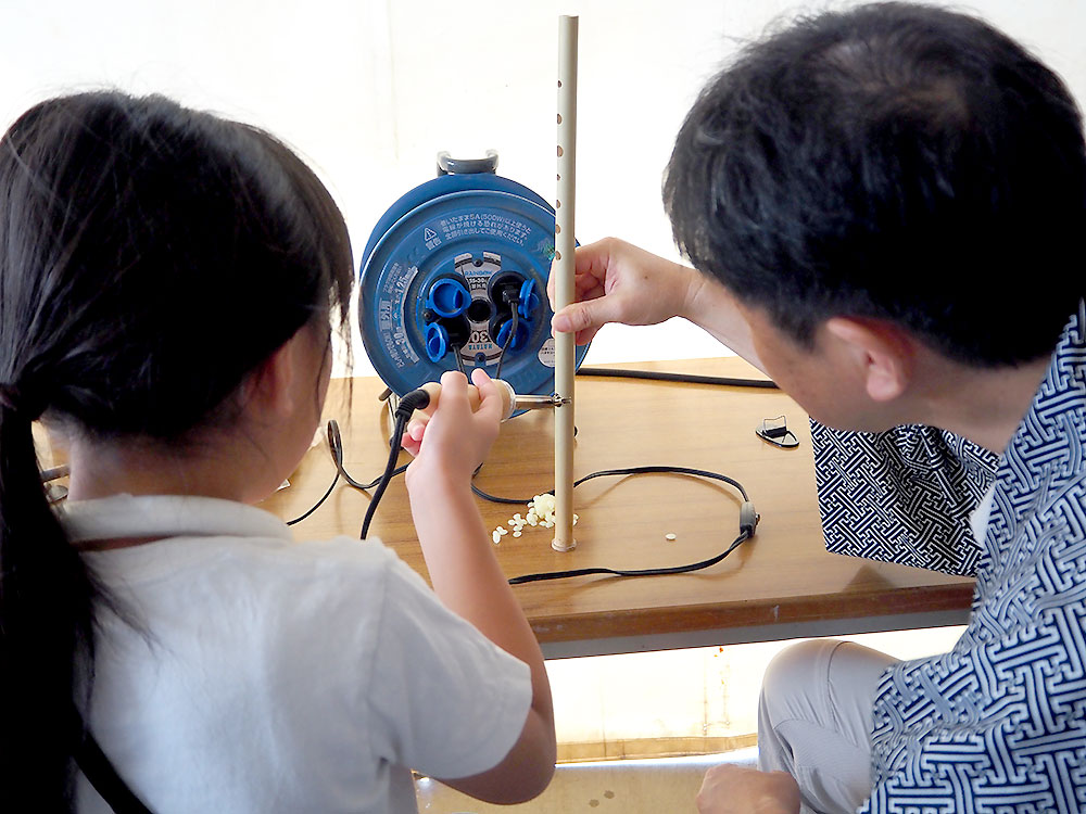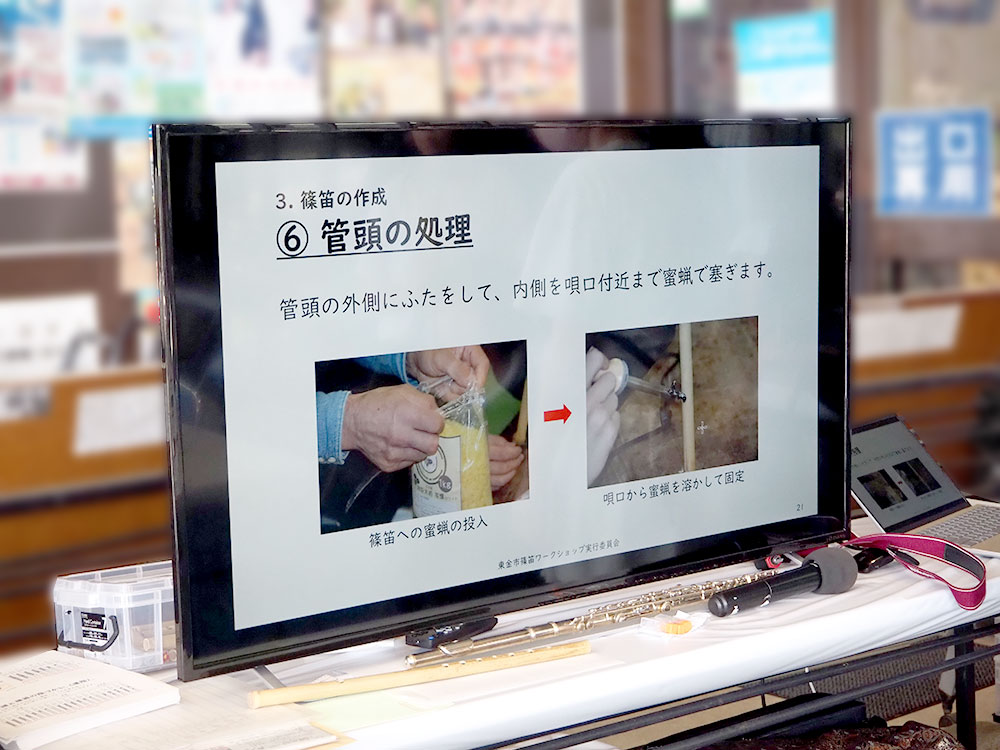 この段階では竹にドレミの穴をあけ、管の端をふさぐために蓋板と蜜ろうを半田鏝で固めているところでした。