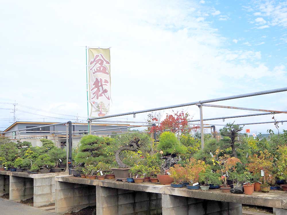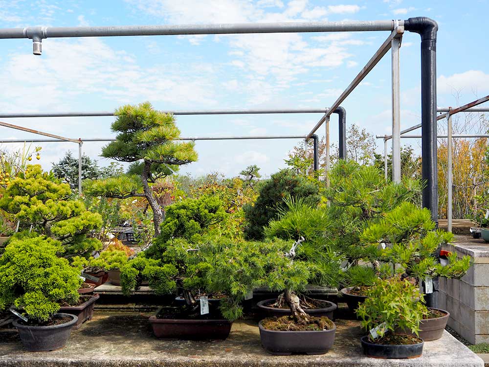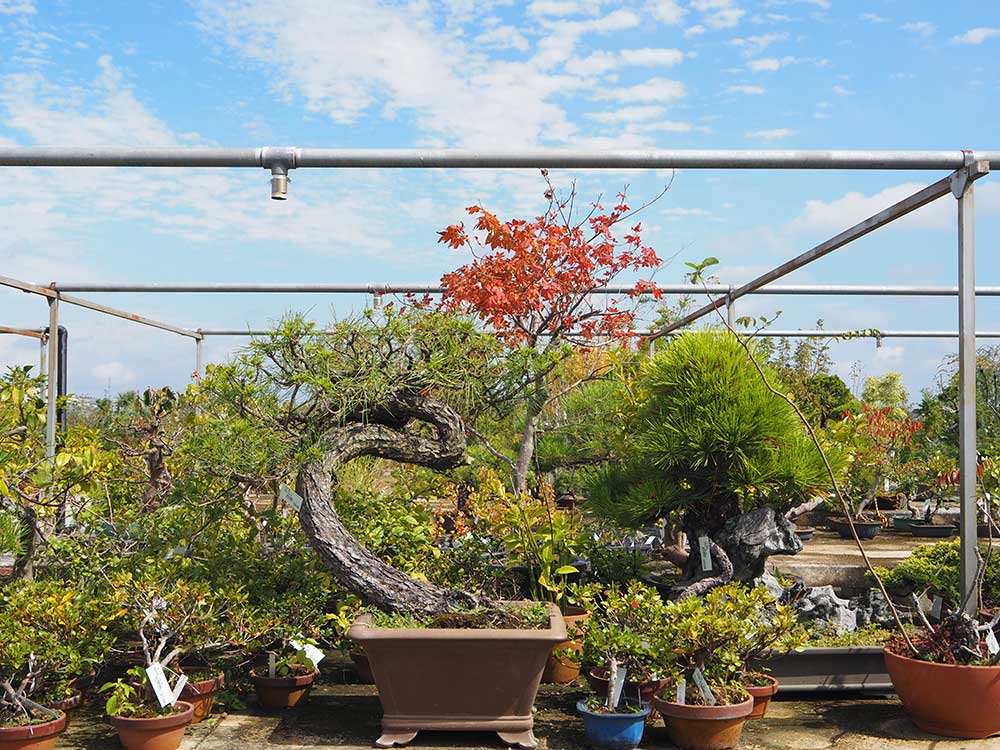 道の駅 みのりの郷 東金 緑花木市場の秋空に映える盆栽棚をご覧ください。