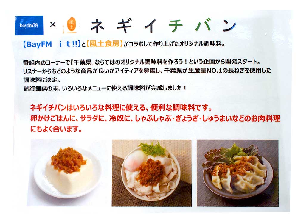 そんな想いから、千葉県が日本一の生産量を誇る「ネギ」をPRするべく、商品内容から商品名、パッケージデザインを、リスナーからアイディアを募集し、「ネギ調味料」を千葉・我孫子の食品メーカー「風土食房」と共同開発しました。