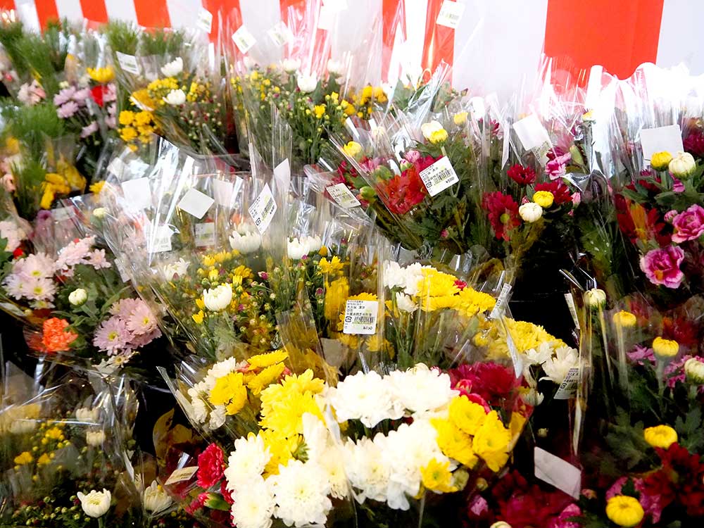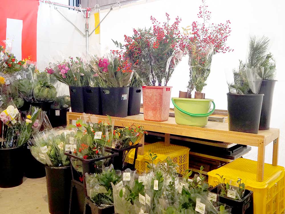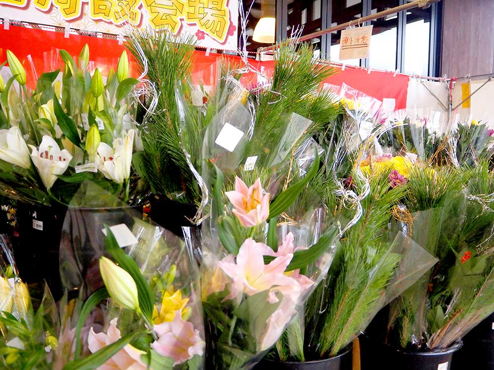 縁起の良いマツなどを中心に、金や銀に彩られた華やかなお花がたくさん並びました。