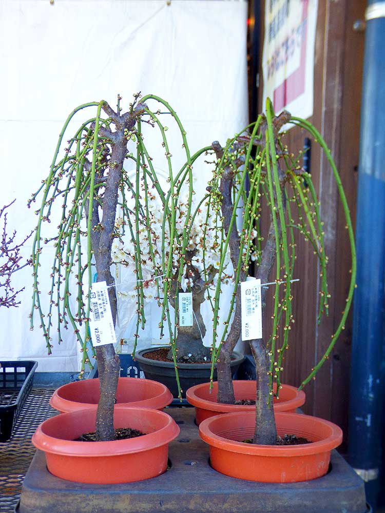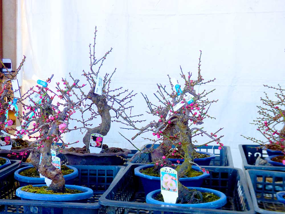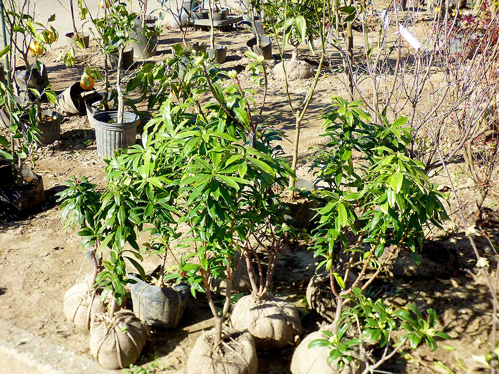 香しい香りが魅力的な沈丁花の苗木が出始めています。また、鈴なりのレモンやミカンの実が付いた果樹苗、これから満開を迎える梅の盆栽などがズラリと並んでおります。