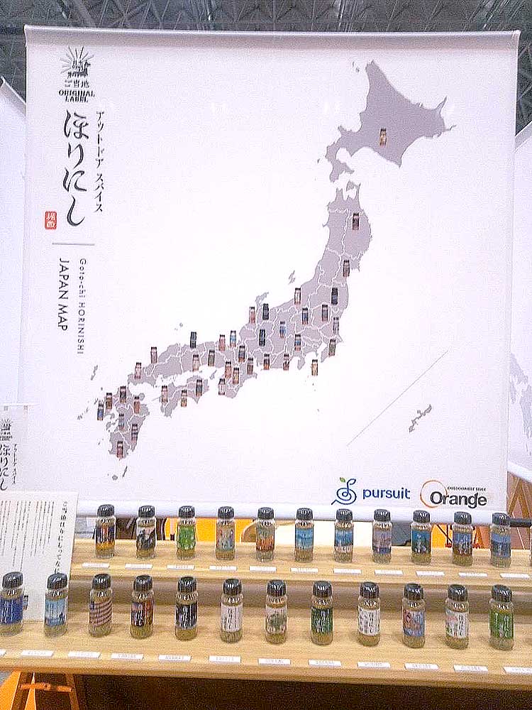 「ご当地ほりにし」ブースでは、各都道府県ごとに違うオリジナルラベルの「ご当地ほりにし」がズラリと並んでおります。