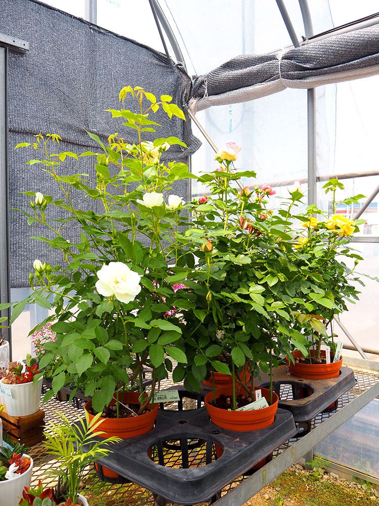 道の駅 みのりの郷 東金 緑花木市場のパイプハウス(ビニールハウス)は春爛漫!いまから見ごろを迎えるバラが少しずつ並び始めています。