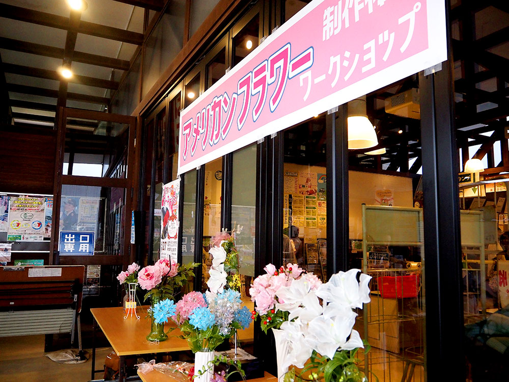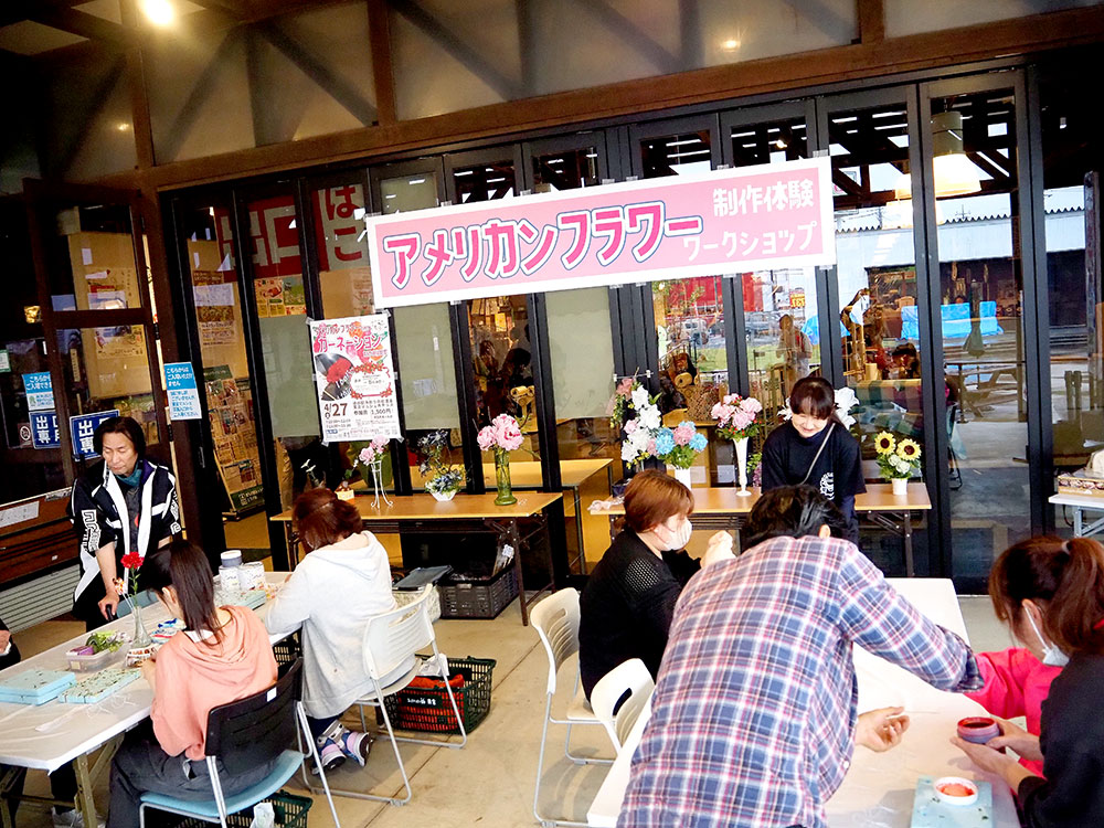 本日は道の駅 みのりの郷東金 東金マルシェ外テラスにおきまして「アメリカンフラワーづくり体験教室」開催中です。