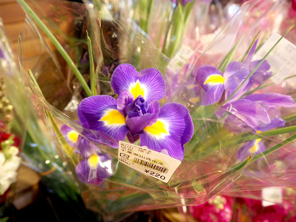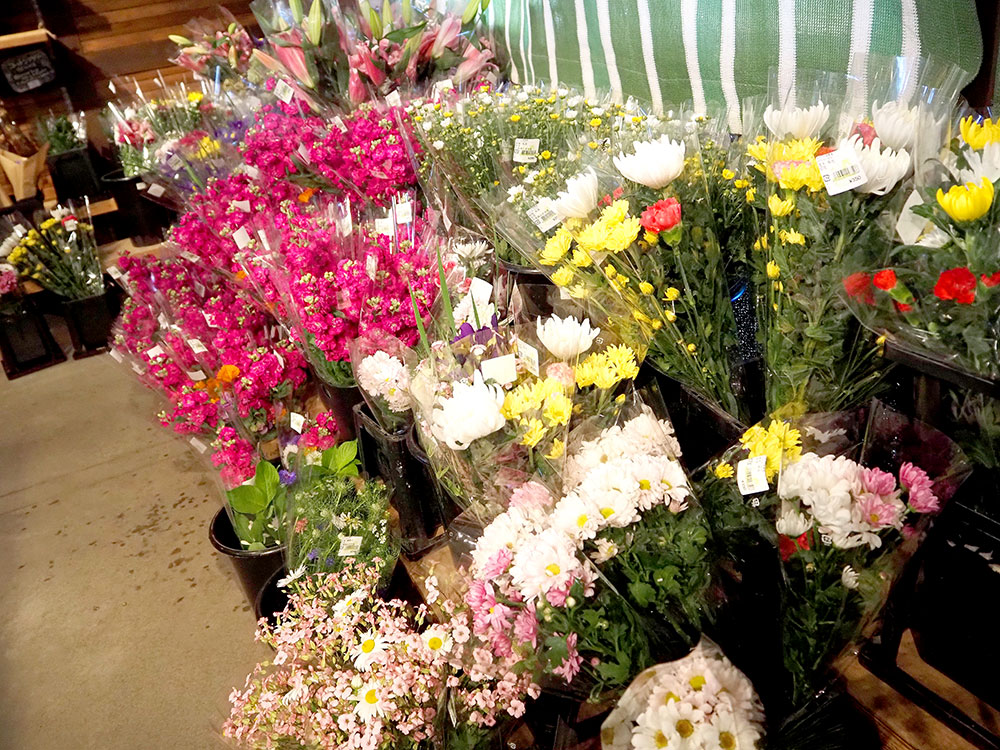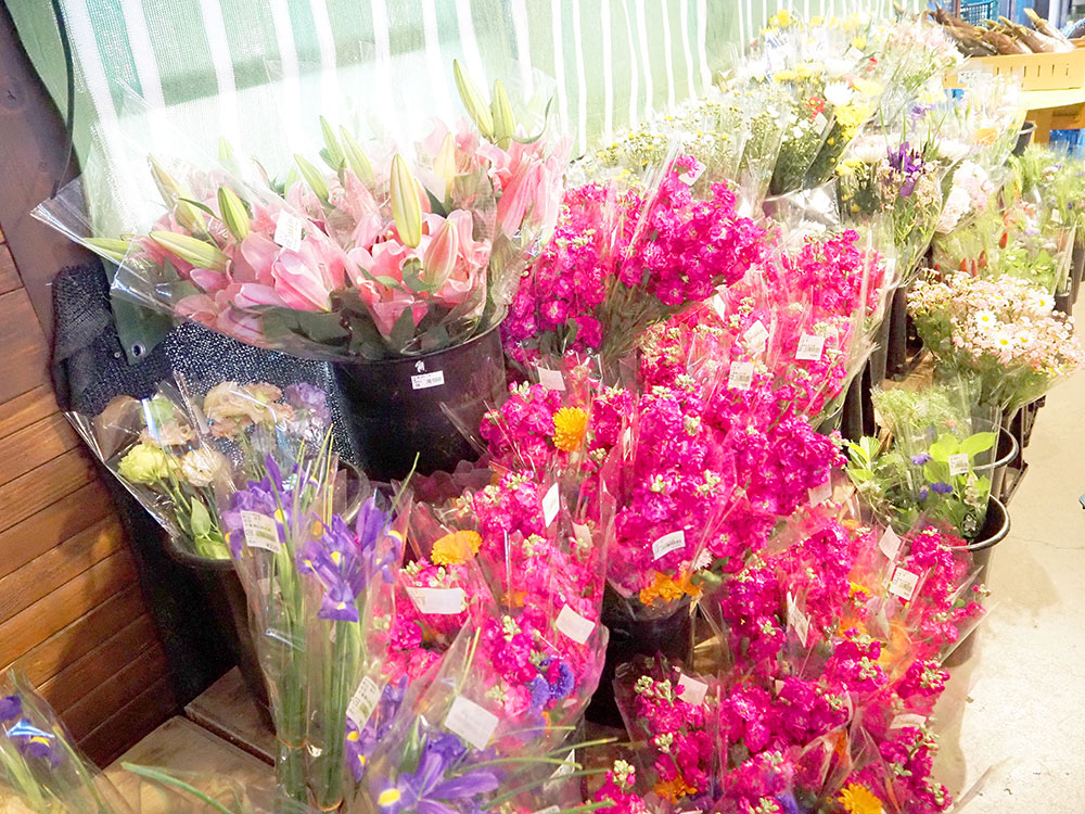 生花コーナーが色鮮やか!ストックをはじめ仏花も並んでおりますので是非ご利用ください。