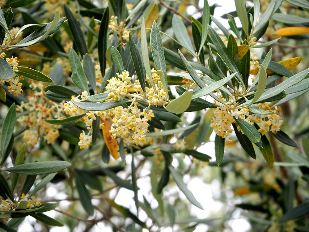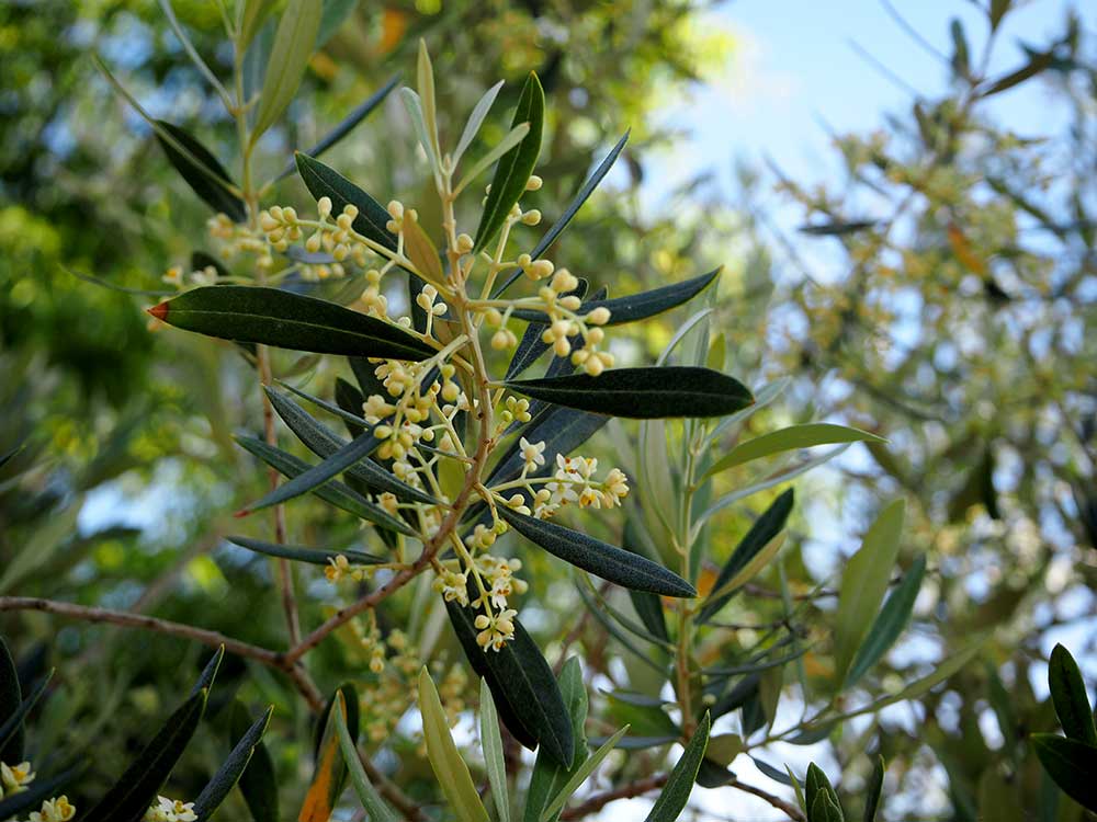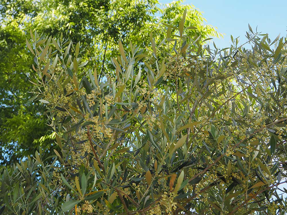 開花中に柔らかいブラシなどに花粉をつけて、品種の違うオリーブの木に受粉させて結実を促してみるとよいそうです。