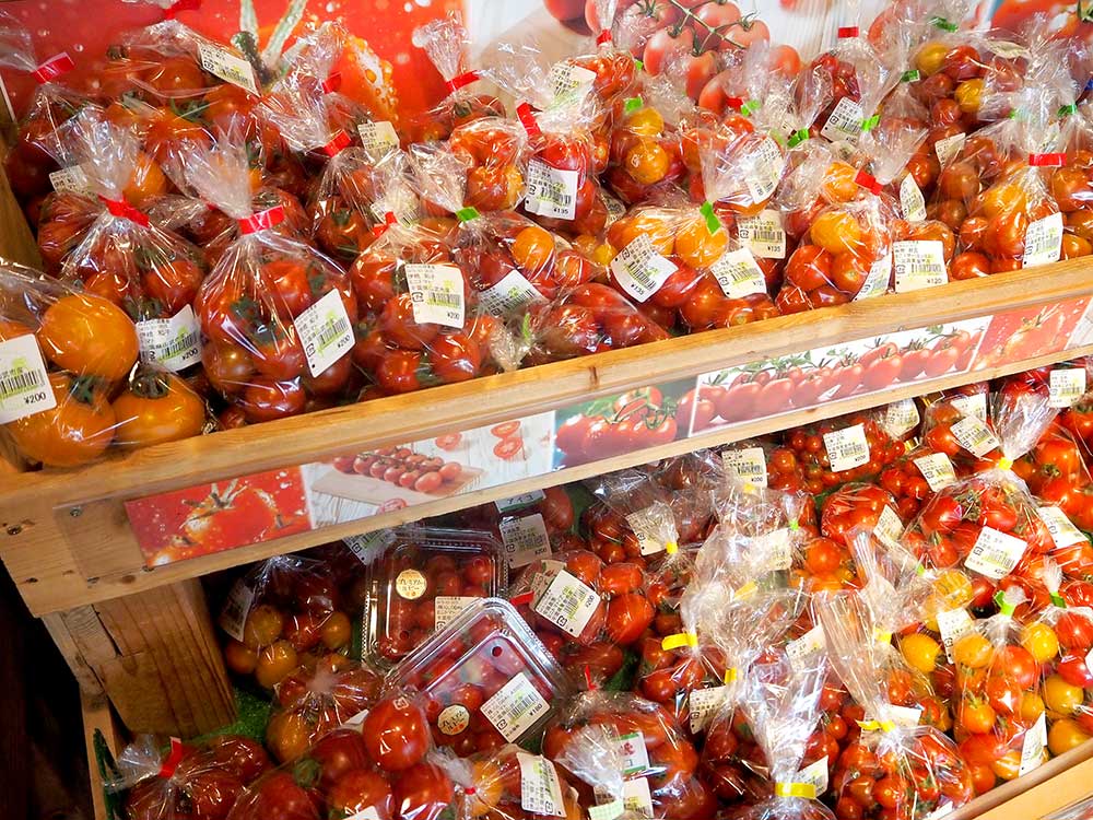 トマトも大玉から小玉まで、完熟がズラリ!ミョウガもたくさん並んでいます。