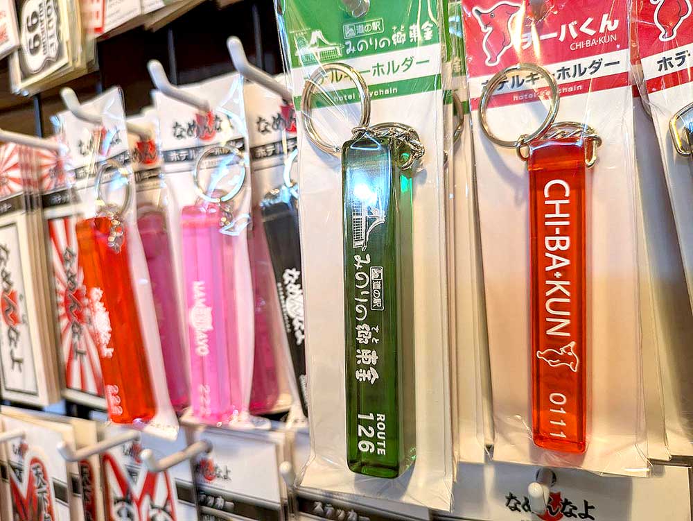 LovesCompanyさんのコーナーには千葉県マスコットキャラクター「チーバくん」のステッカーやエコバッグなどもズラリと並んでいて、そこにこちらのホテルキーホルダーも並んでいます。