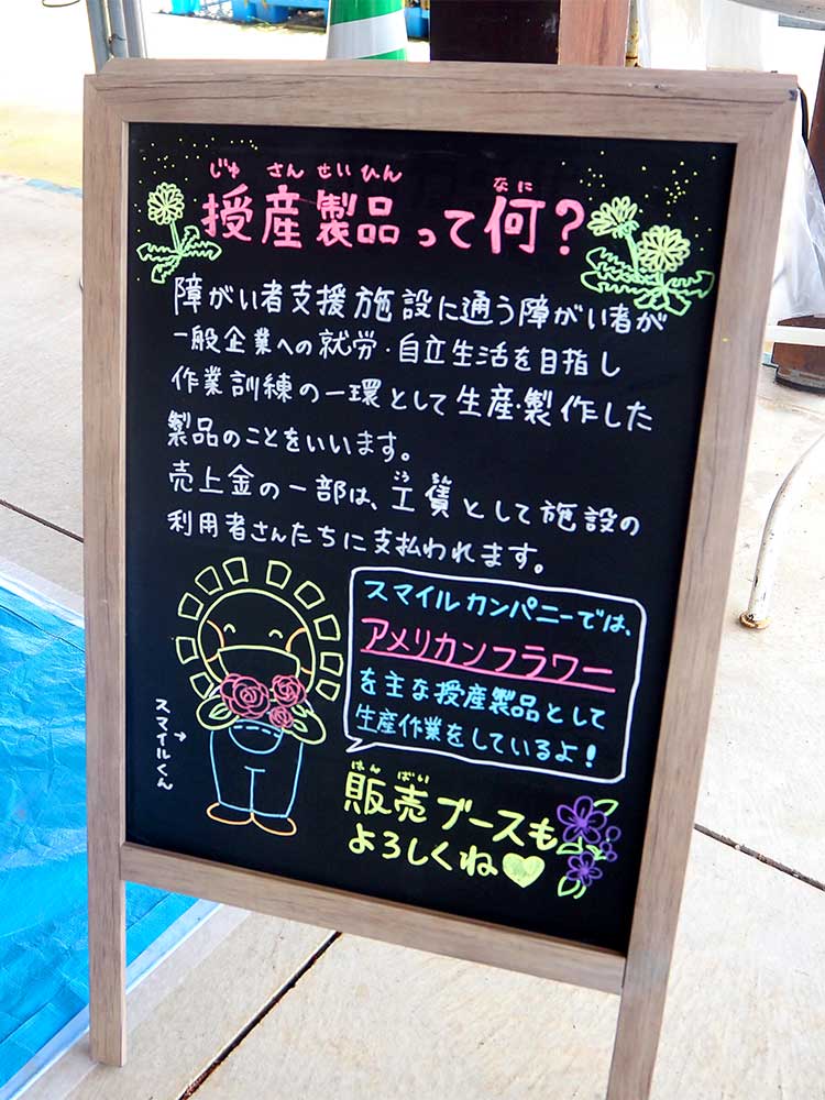 就労継続支援A型事業所 スマイルカンパニー代表の石川先生やスタッフの方々が丁寧な指導とサポートをしてくれながら、今回は夏らしい「ひまわり」を作りました。