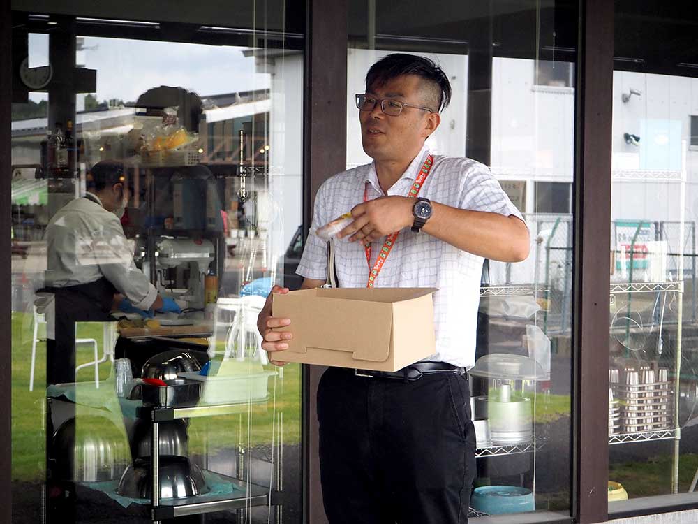 牛乳を使ってお菓子やお惣菜を作っているところをガラス越しに見学してもらいました。