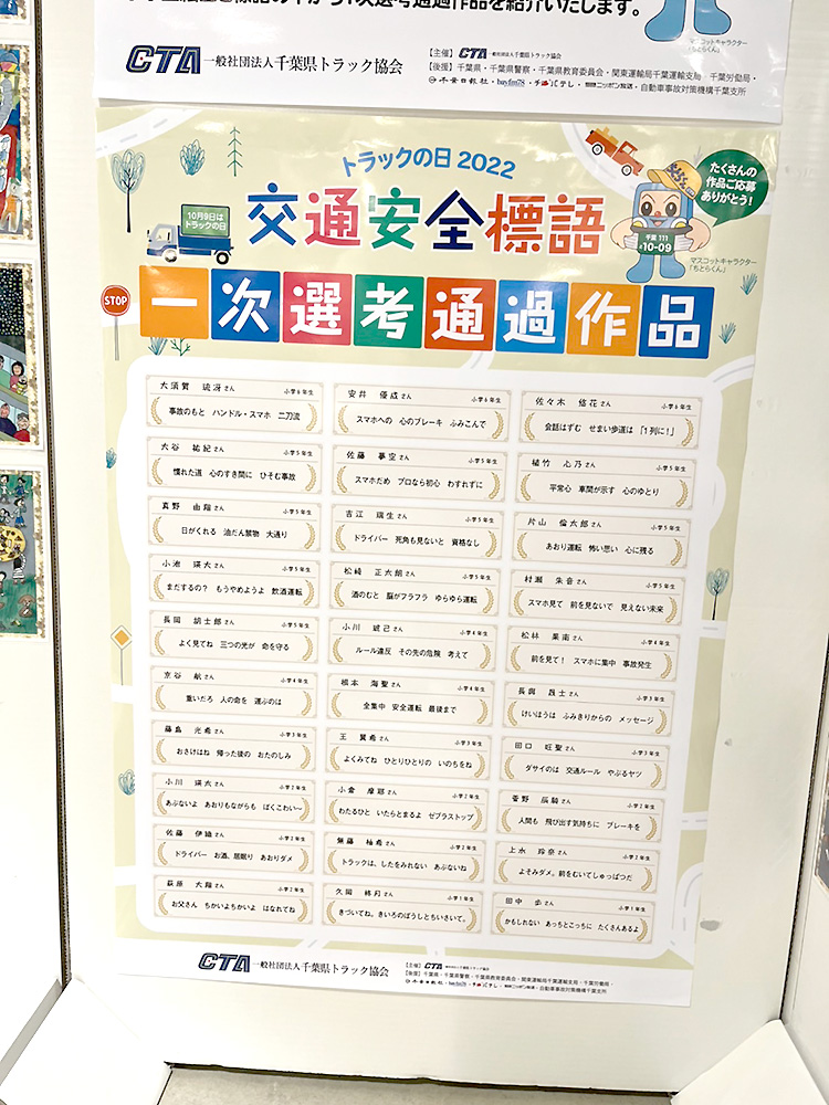道の駅 みのりの郷東金 東金マルシェ情報発信コーナーにおきまして、2024年10月17日(木)~10月23日(水)まで「トラックの日2024 交通安全標語児童絵画コンクール展示会」(千葉県トラック協会山武支部)が開催されます。