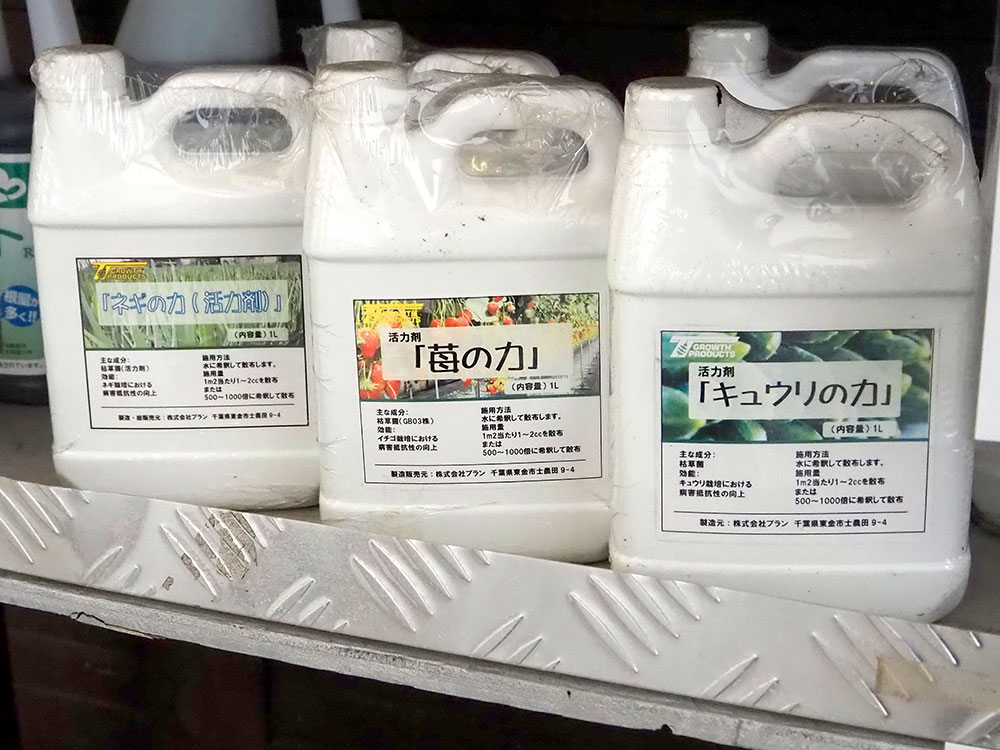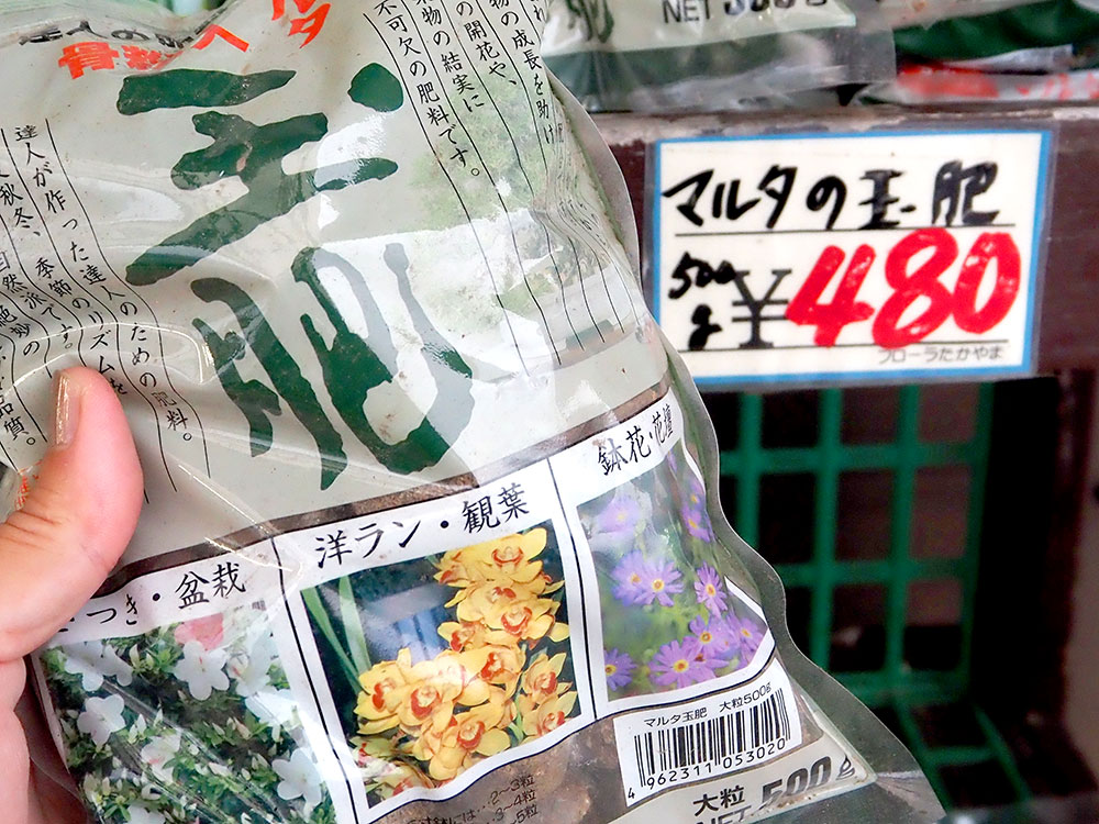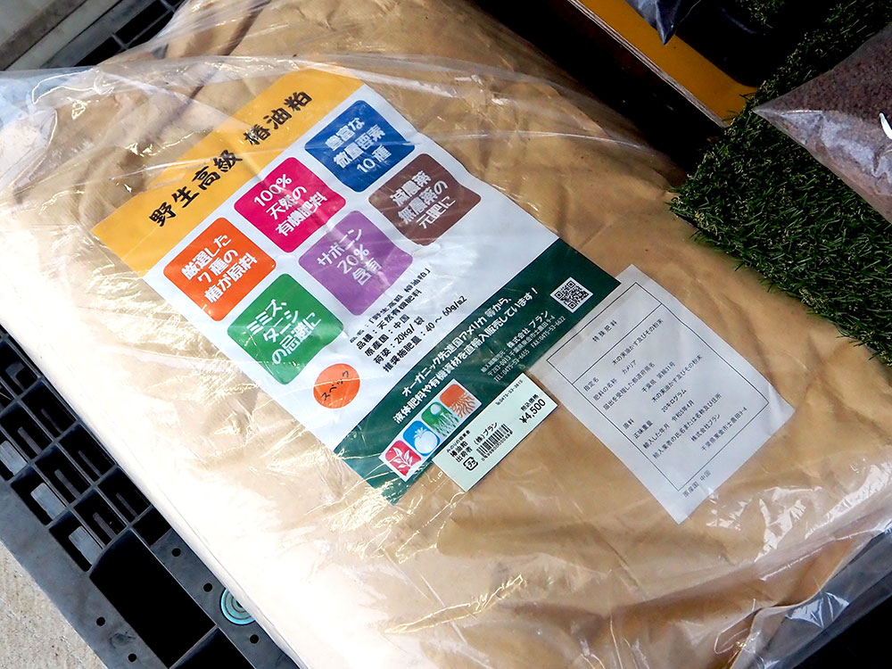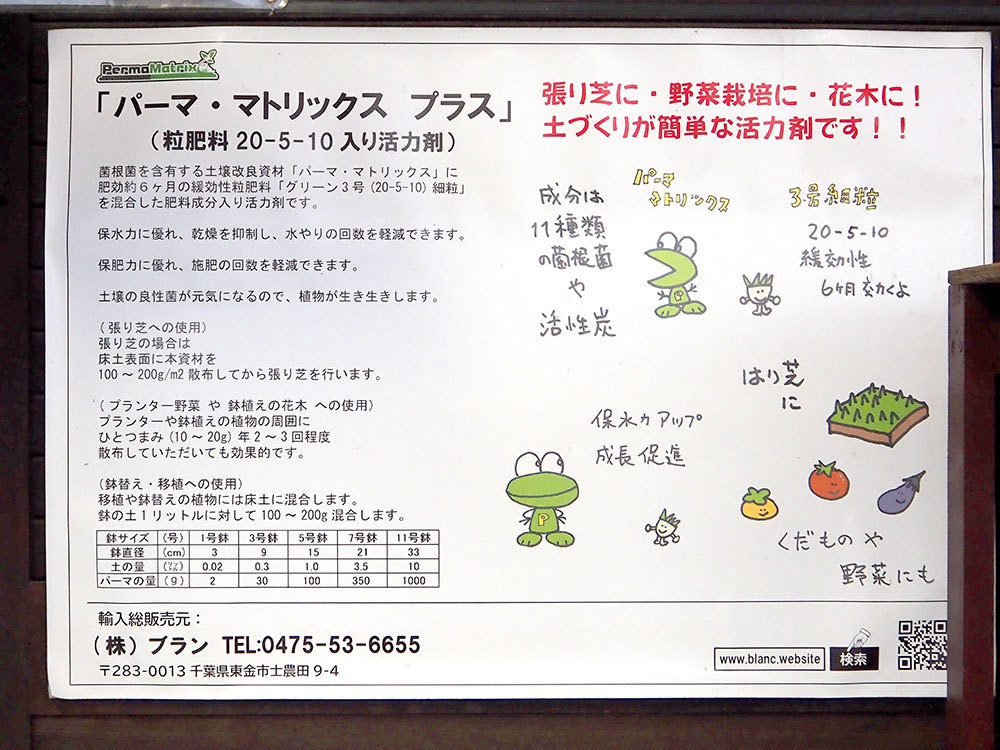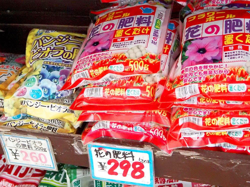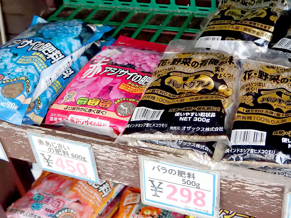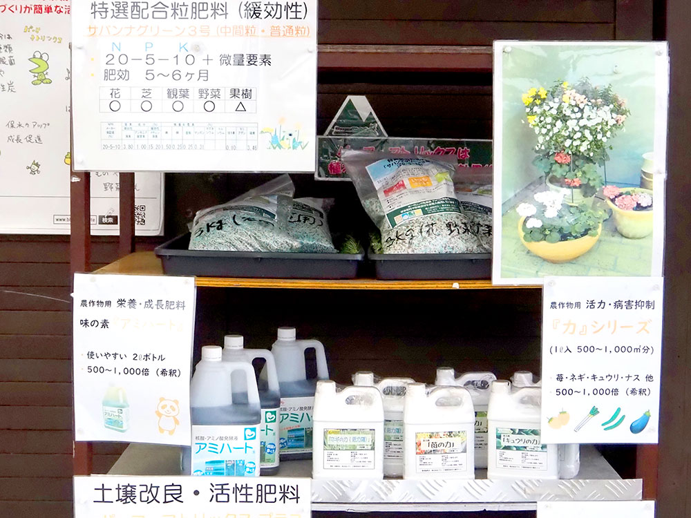 道の駅 みのりの郷 東金 緑花木市場では、樹木や花苗などのほか、おすすめの肥料も並べています。