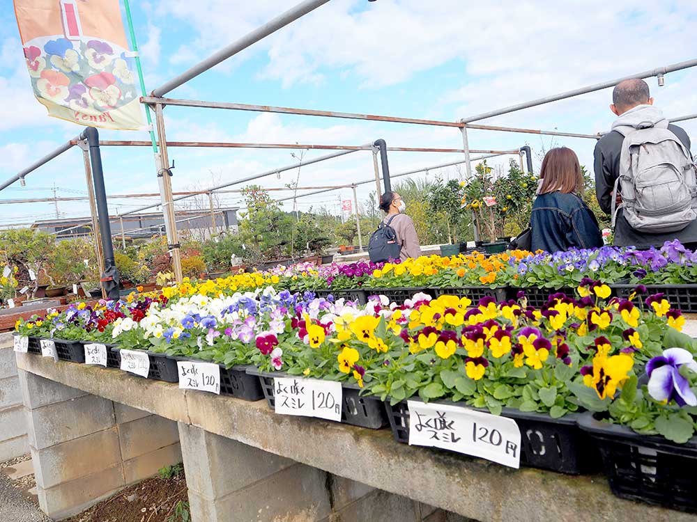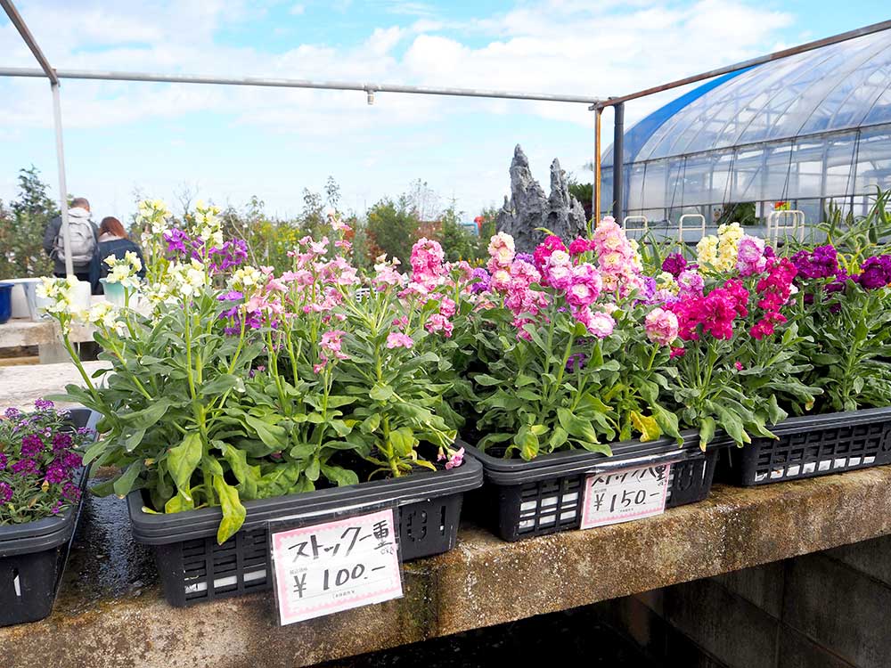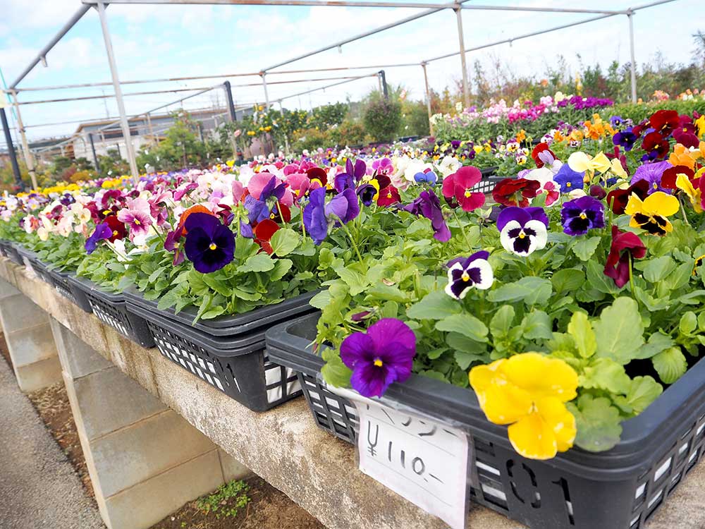 お手頃なパンジーやスミレ、香り高いストックなどの花苗がズラリと並びました。今が植えどきですよ!