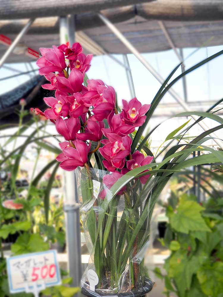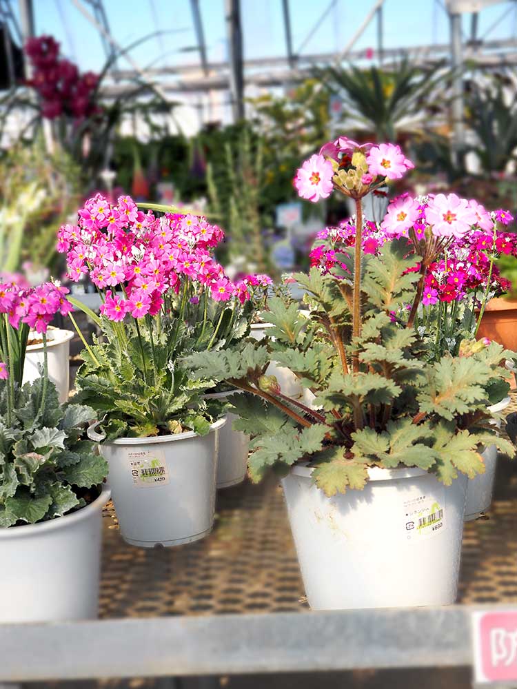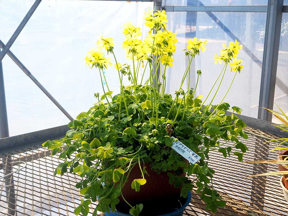 オキザリスのほか、サクラソウやシンビジュームの鉢植えなど、可憐なものから華やかなものまで並んでいます。